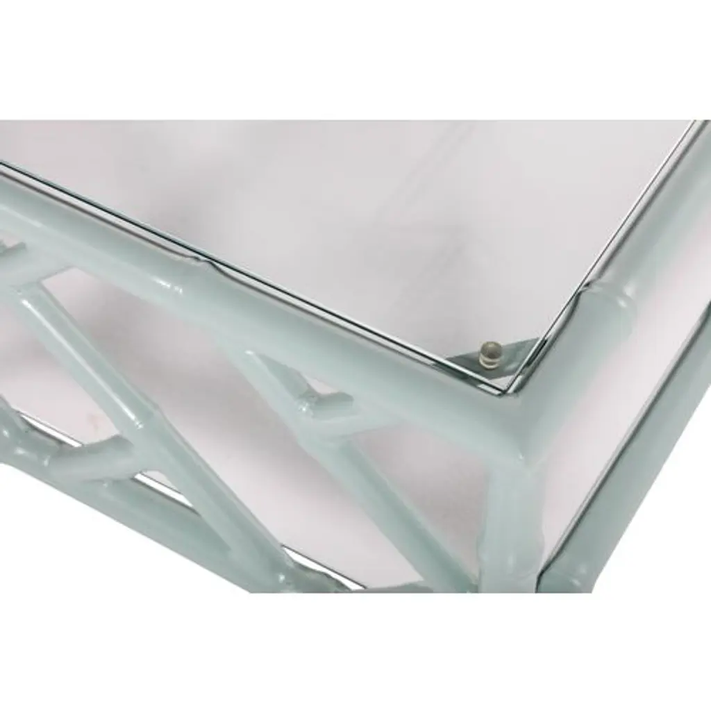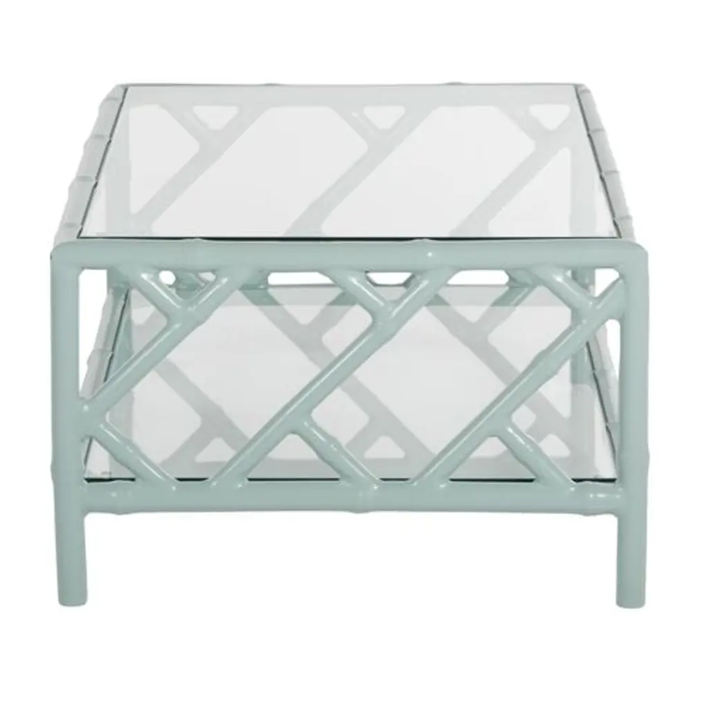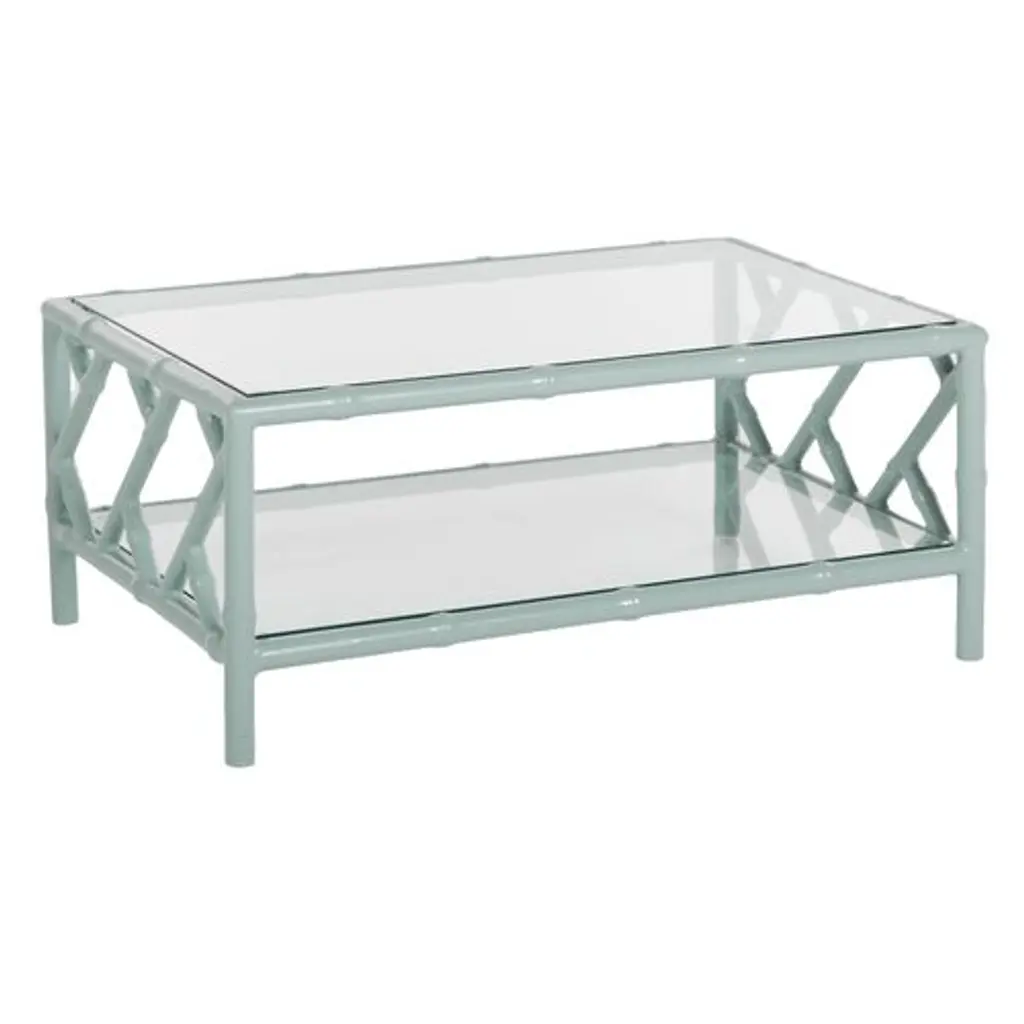 Designed in collaboration with Celerie Kemble exclusively for One Kings Lane: Offering a modern update on classic Chinese Chippendale designs, this outdoor coffee table showcases aluminum fretwork with a custom glossy celadon finish. The tempered-glass top and shelf provide plenty of sturdy space for resting drinks and stashing sunscreen, magazines, and other must-haves.