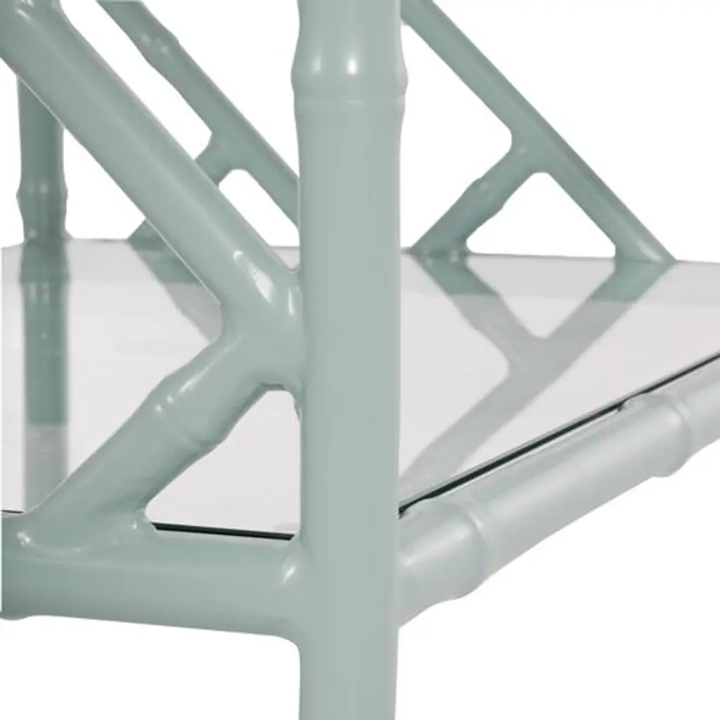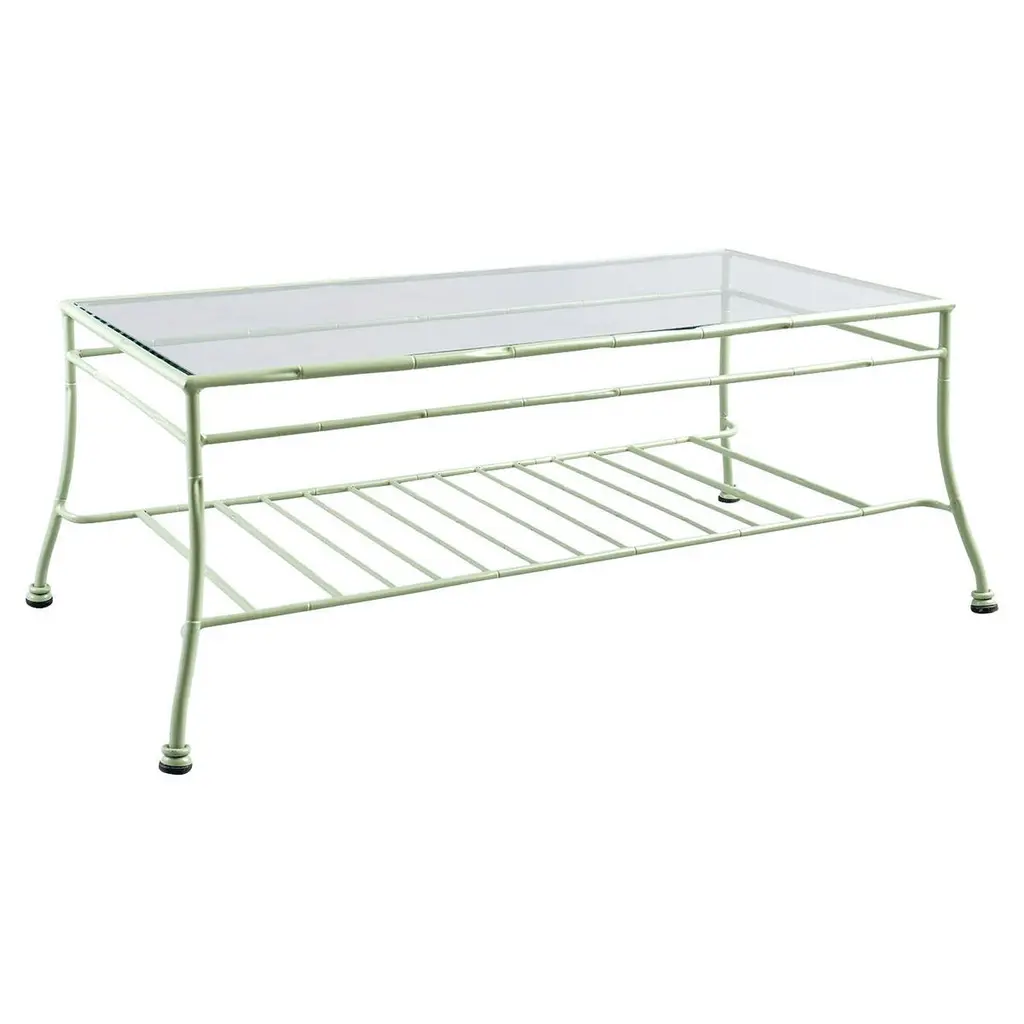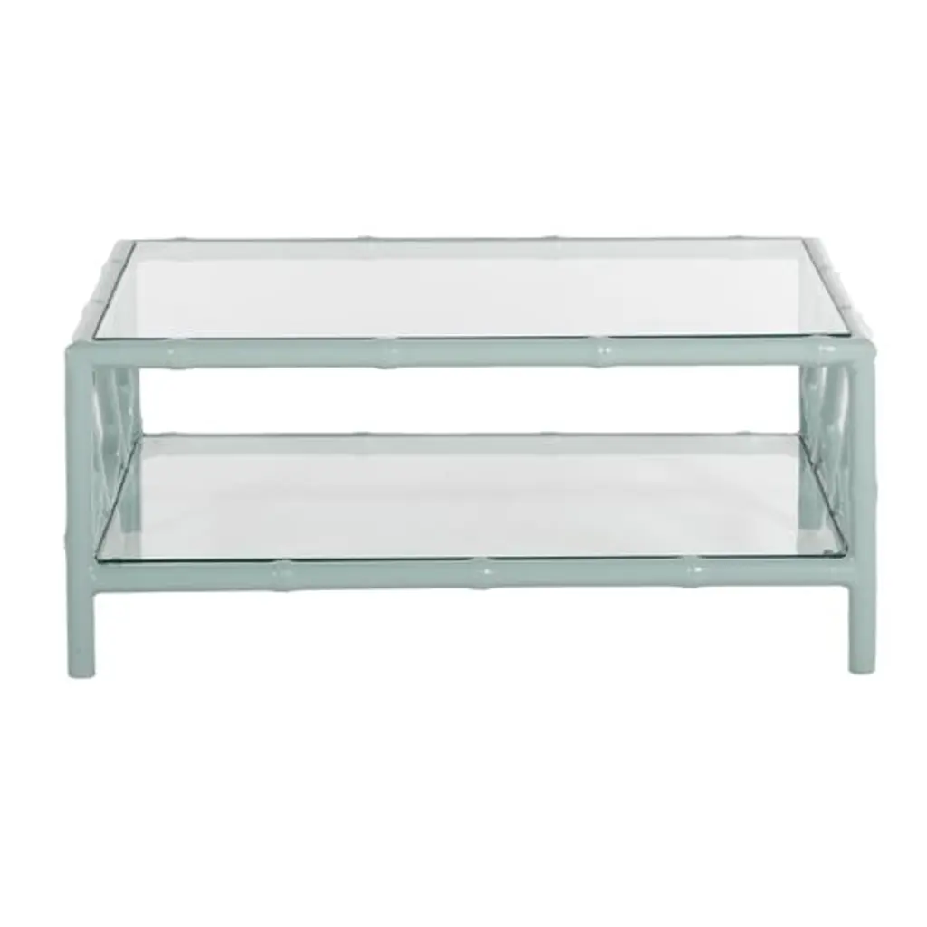 Designed in collaboration with Celerie Kemble exclusively for One Kings Lane: Offering a modern update on classic Chinese Chippendale designs, this outdoor coffee table showcases aluminum fretwork with a custom glossy celadon finish. The tempered-glass top and shelf provide plenty of sturdy space for resting drinks and stashing sunscreen, magazines, and other must-haves.