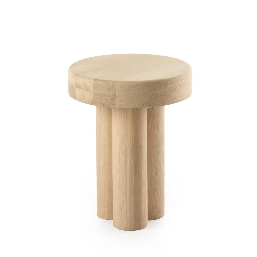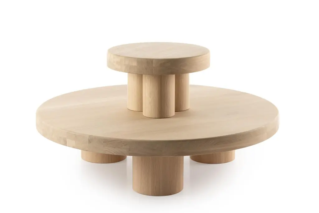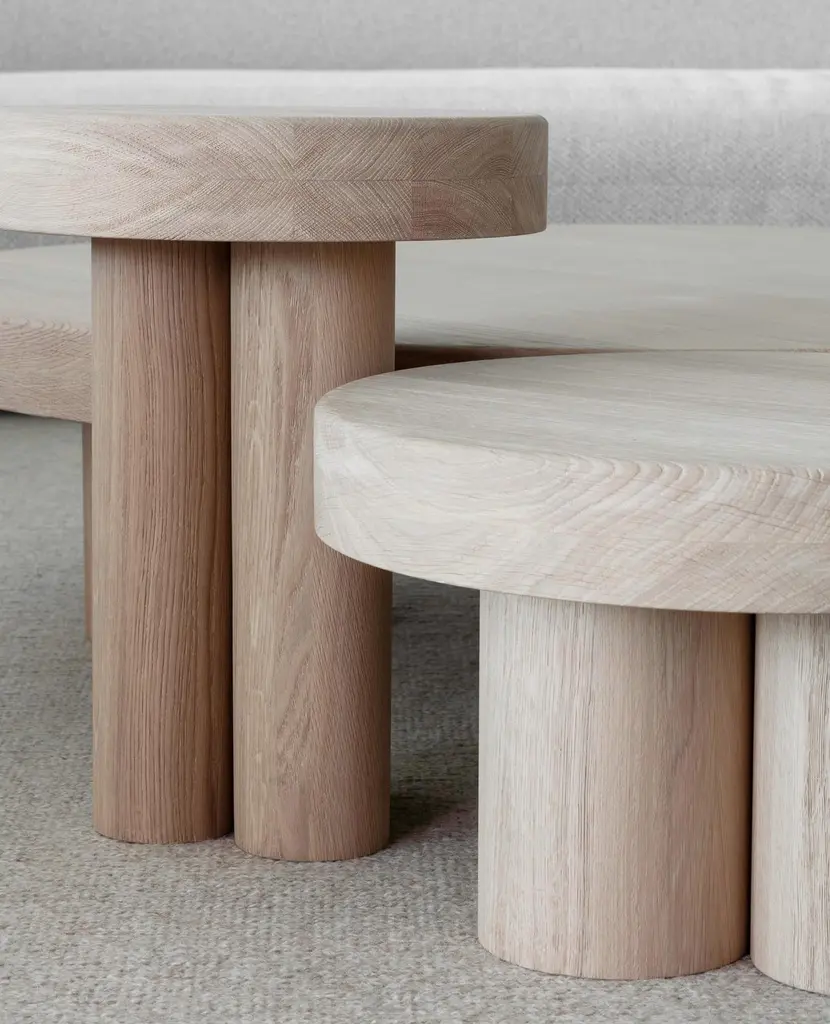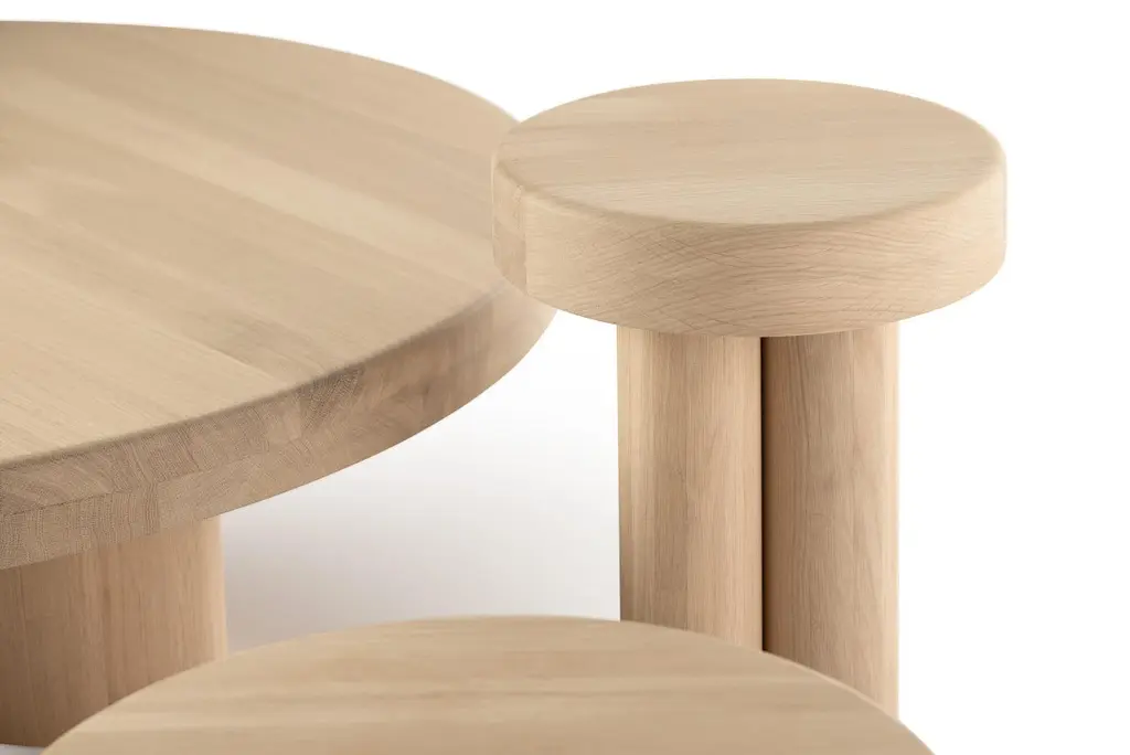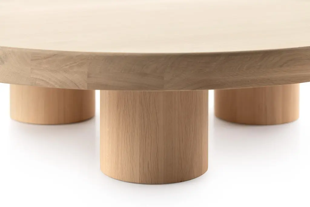 A new interpretation on brutal design. These round coffee tables have been made to last forever. It will stand for 100 years and more. These round coffee tables in 100% solid French oak have 3 central feet also made of solid French oak. The legs are made on a traditional wood lathe. The table top has a thickness of 7cm where the edges have been thickened from 3cm to 7cm solid oak. These tables are available in numerous sizes from Ø35 up to Ø 250cm and in different heights and finishes. Make a combination you like! Beautiful in the living room of your house but also in the central hall of your office, hotel or in a public building. Work with quality, live with quality!