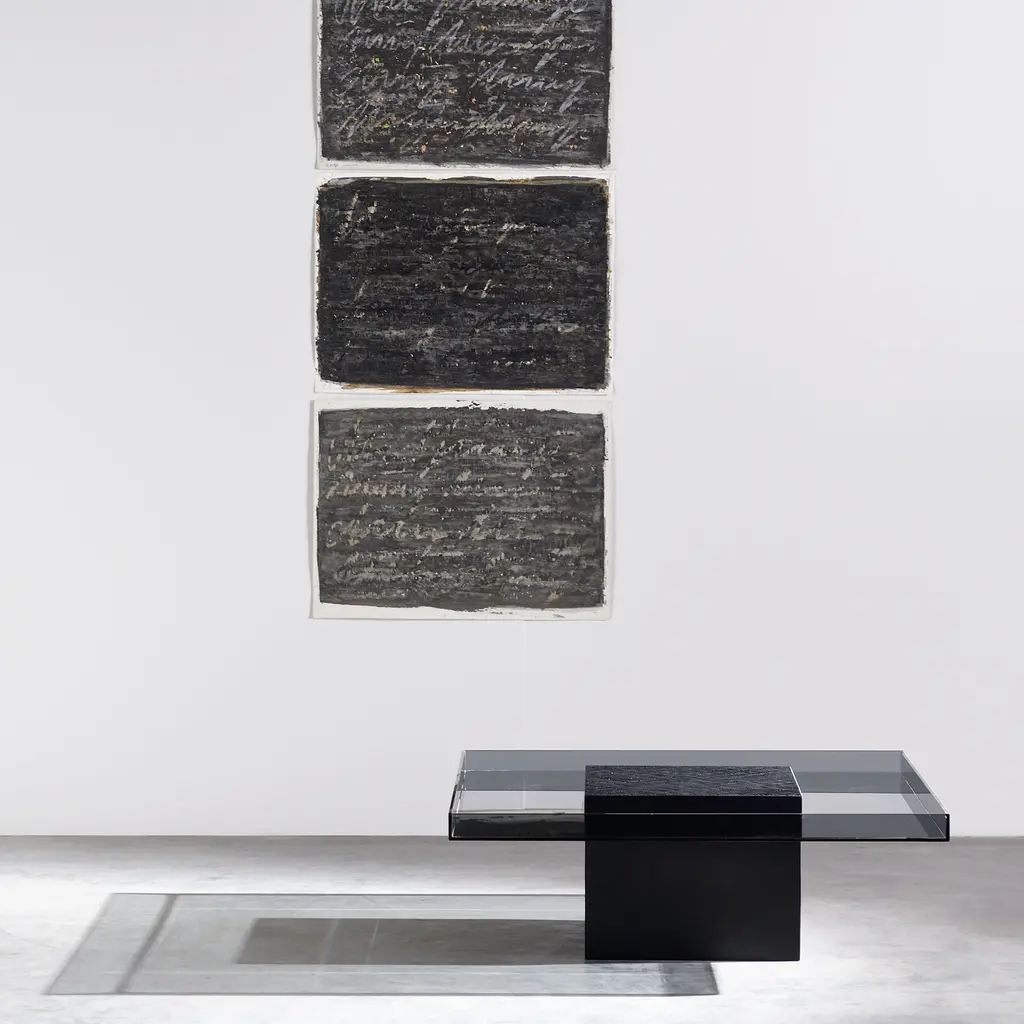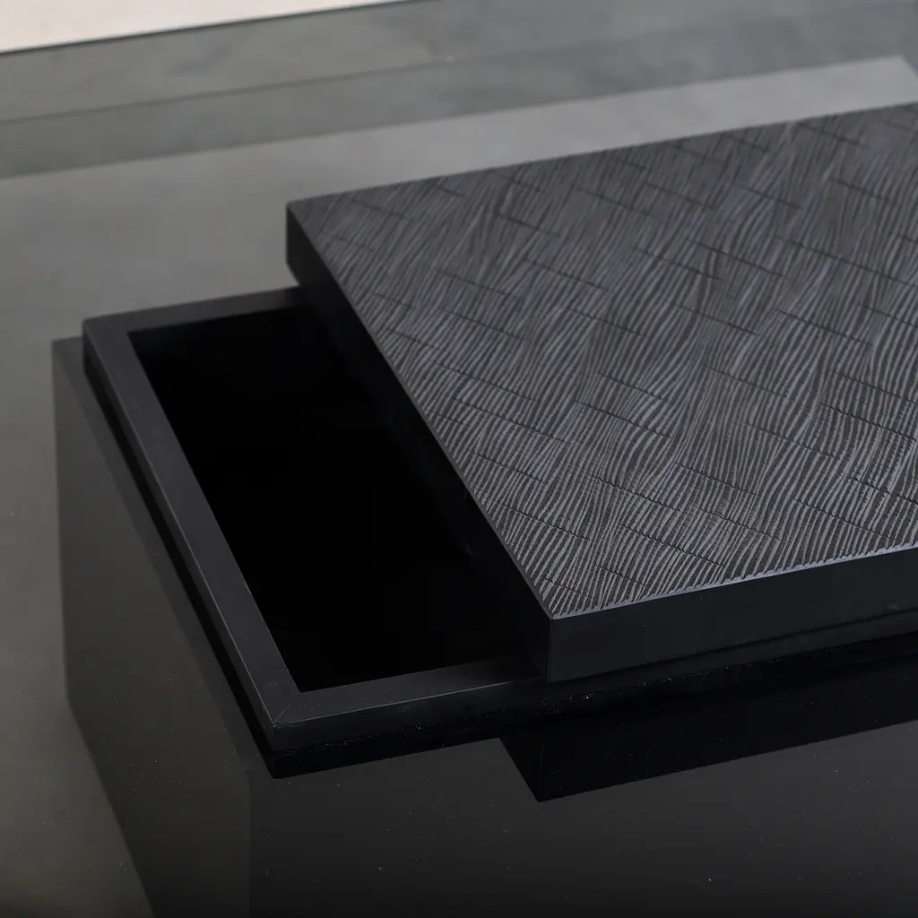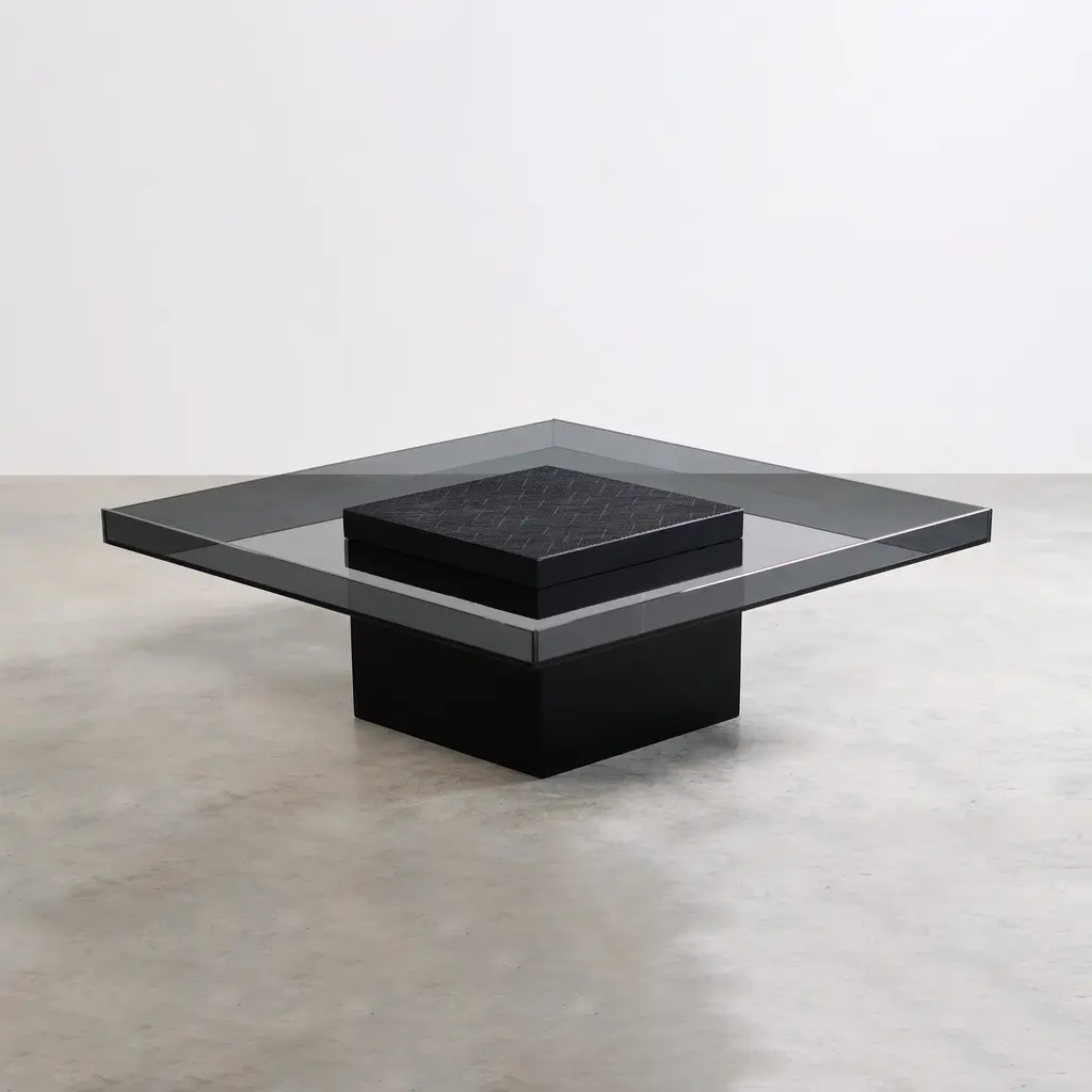 In this boldly scaled square version, Koba combines the sleekness of glass and the warmth and tactility of solid wood with a hand-carved flourish. French designer Jean-Marie Massaud’s coffee table features a central cube base in matte-finish, black-stained maple that squarely intersects a smoked glass tabletop, framed around the edges. Lifting the carved central section’s lid, with its texture reminiscent of burnt wood, reveals a storage compartment while the base also contains an easily accessible “secret” space.