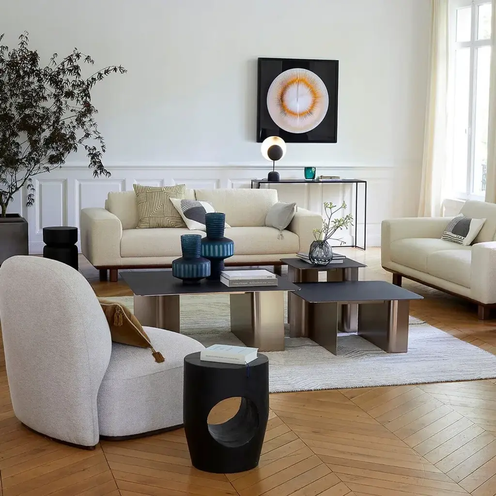 Koldi coffee table with graphic lines for use alone or in combination with the other models in the collection. Made of black stained mango.