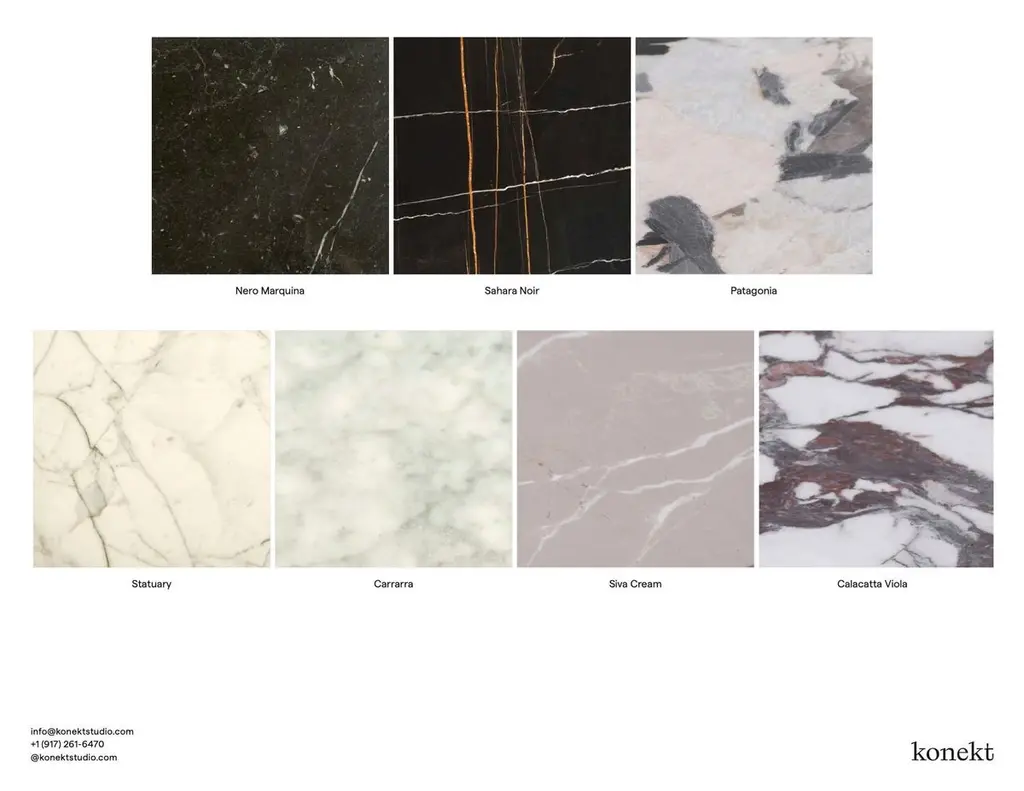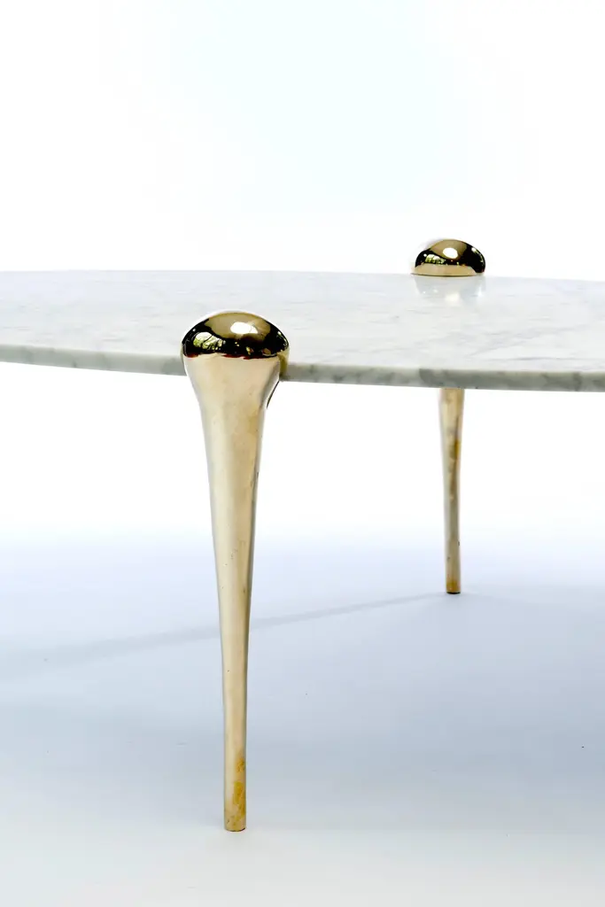 The Petra coffee table features an oval honed & enhanced marble table top and four sculptural polished bronze legs. The bronze legs are inspired by the strong yet elegant hind legs of a camel, and are sand-cast at a local Pennsylvania foundry from a hand-shaped mold.This table is available now exactly as pictured, with Sahara Noir marble. It is also available made to order with a variety of marble options.The table legs are made with the age old technique of sand casting, which uses sand as the mold material and can produce unique characteristics such as pitting and surface variations in the metal. These features are inherent to the casting process, and should be embraced as highlighting the unique and hand-made nature of each piece.Marble top dimensions - 54"W x 26"D x 17"HOverall dimensions - 57.5"W x 29.5"D x 19.25"H.