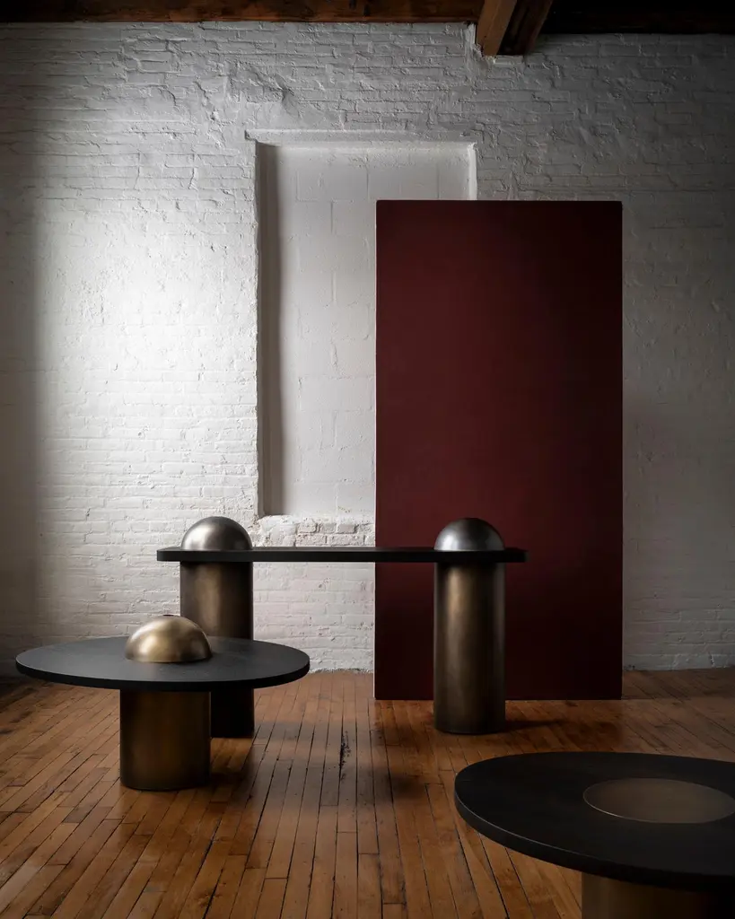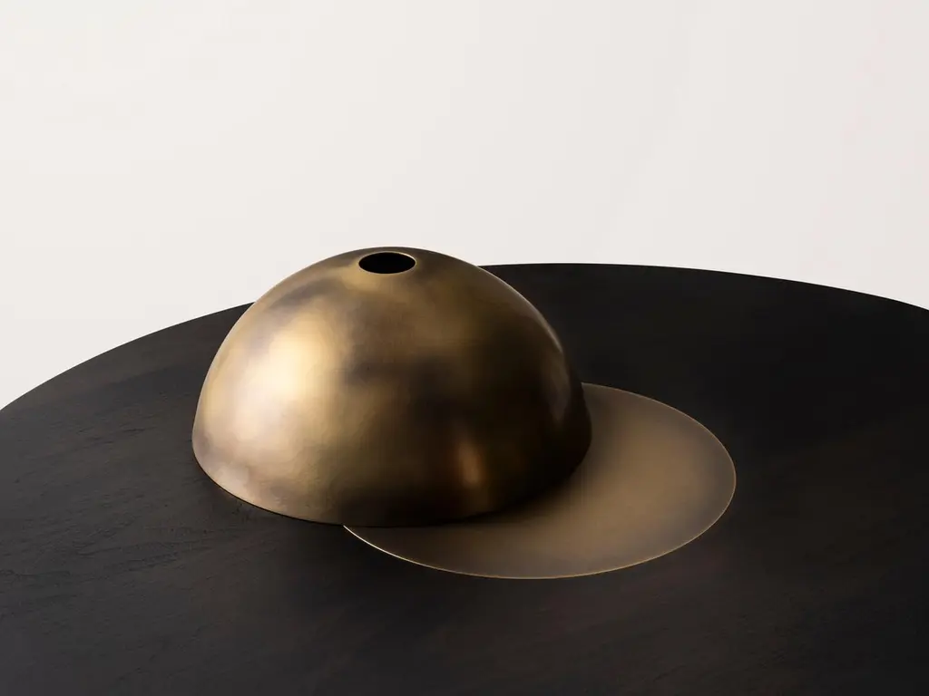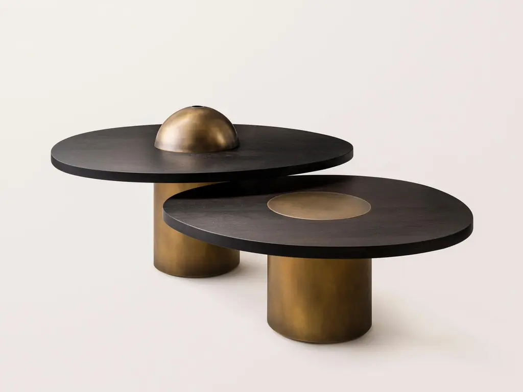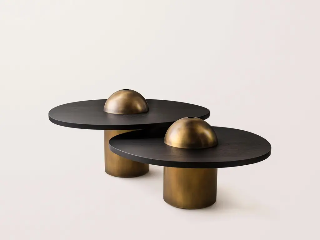 Inspired by the form and function of grain silos, the sculptural Silo Coffee Tables feature solid wood and hand-finished brass or stainless steel wrapped legs. The coffee tables are available in two height options and four sizes to allow for various nesting formations. See other listings for the medium, large and X-large sizes.This listing is for the Small size (36"L x 30"W) in antique brass and ebonized walnut. Choose between height options of 13.25"H or 16.5"H.Please inquire for pricing of other metal and wood options. Custom dimensions also available.This listing does not include the removable brass dome shown in some images, please inquire for pricing with dome addition. The hollow dome serves both a decorative and functional purpose, creating a playful location to store small objects such as TV remotes, matches and coasters. The dome can be removed and stored elsewhere as desired.Made by hand in Pennsylvania. Please inquire for current lead time.