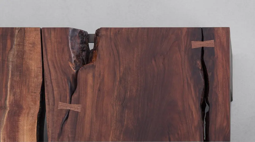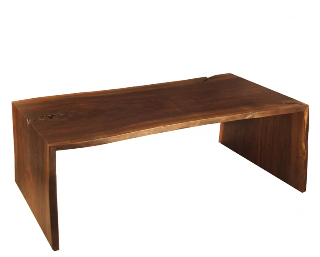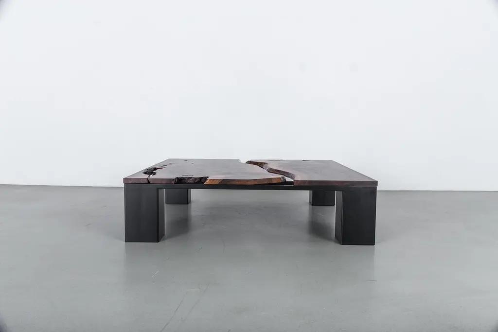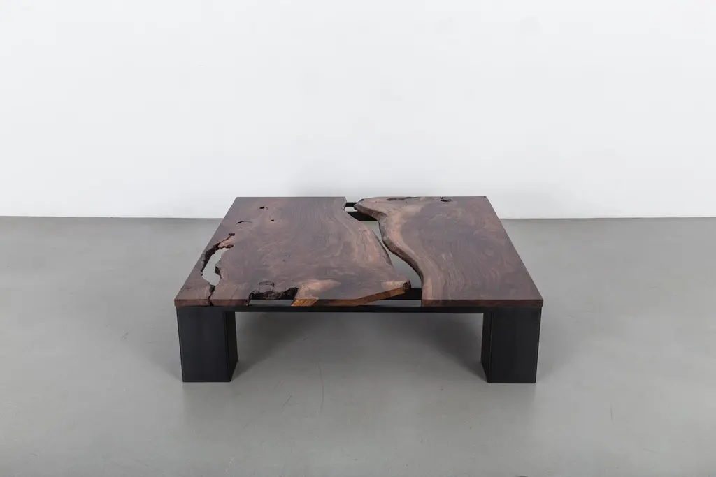 The Kong coffee table is created from a solid wood top in a walnut finish, set on a steel frame. Its visual balance of form and weight creates a dynamic contrast with the organic edge detail towards the center of the table top. The Kong Coffee table's elegantly monolithic profile is a great talking piece in the common area and makes a bold canvas for your oversized coffee table books.Our slabs are locally milled, dried, and come from sustainably harvested trees. Grain, color and natural characteristics vary from slab to slab, making each Kong Coffee Table a unique work of art.This table is available in many domestic hardwoods and finishes and is available in custom sizes. Made to order with loving care in our Denver, PA workshop.