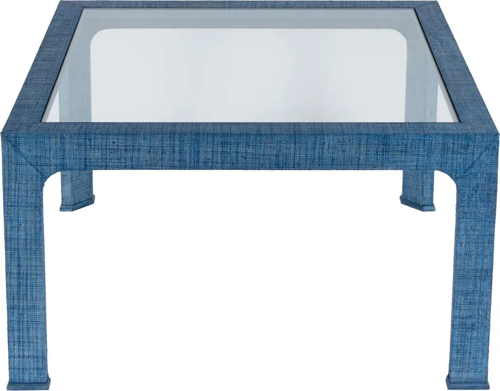 Designed by us and available only at One Kings Lane: This square cocktail table rests a clear glass top within a frame covered in richly textured raffia for the ultimate in organic elegance. The rounded apron corners heighten the allure.
