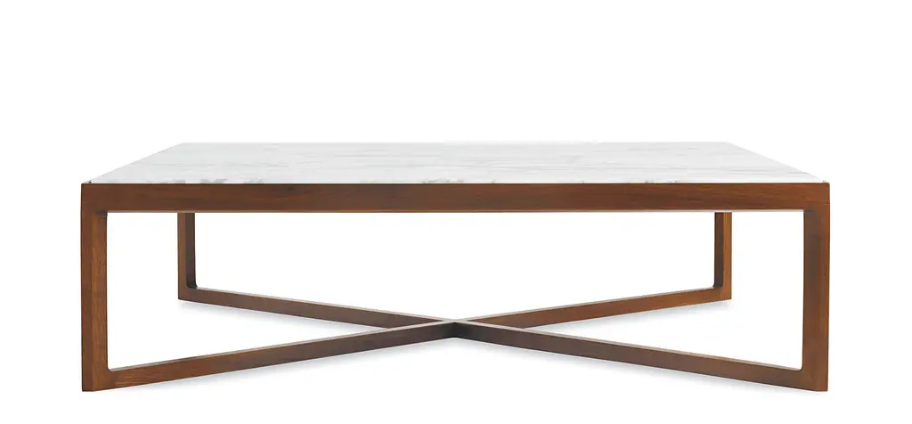 In keeping with the simple linear forms of the Krusin Chair series, the new Krusin Occasional Tables serve up clean, graceful lines in a range of finishes and table top options. The Krusin Coffee Table with Marble Top is constructed of an angular frame in select American and European hard woods, featuring dowel and mortise & tenon joinery. The cross-base footing provides a dimensional, shadowing effect at the bottom of the table frame. Marble table tops rest within the frame and are made of 0.75” thick coated marble in a polished or satin polyester coating. Select 10-inch or 15 inch height in Arabescato White-Grey Marble or Calacatta White-Grey Marble table top. Then select from 15 base finishes.