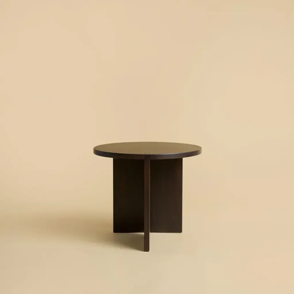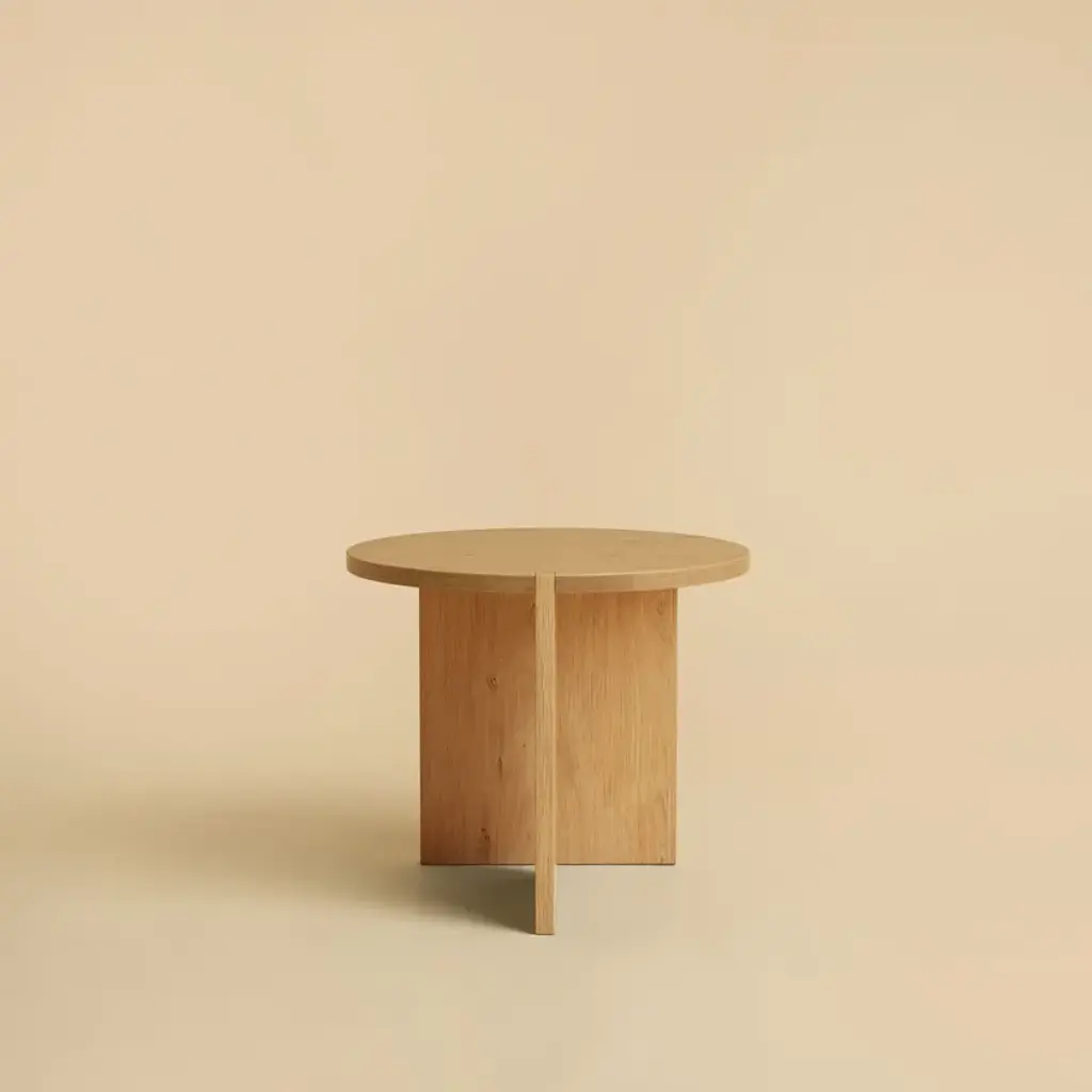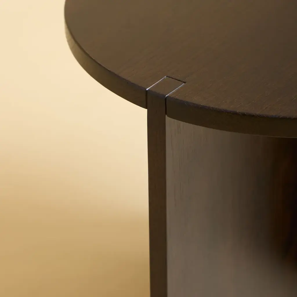 Kume is a coffee table made entirely of solid oak wood. The top is circular and has a diameter of 45cm, the legs are made from two glued solid wood boards in which one part is interlocked on the top. Available in oak and smoked oak finishes.