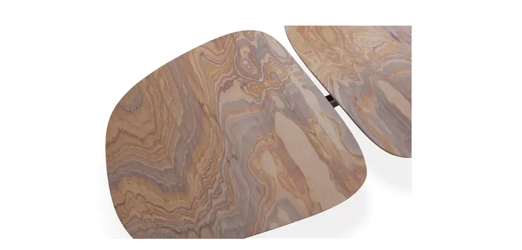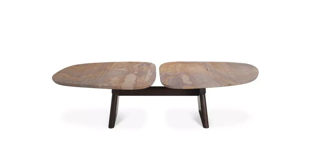 Japanese-inspired, the top of the Kumo cocktail table is split into two irregularly shaped but equally-sized pieces. The matching end table features one of these shapes. The trays are made of sand stone, a warm-toned mineral from Rajasthan, and evoke the idea of water receding across ancient stone. The sandblasted and black stained solid ash bases complete the design.