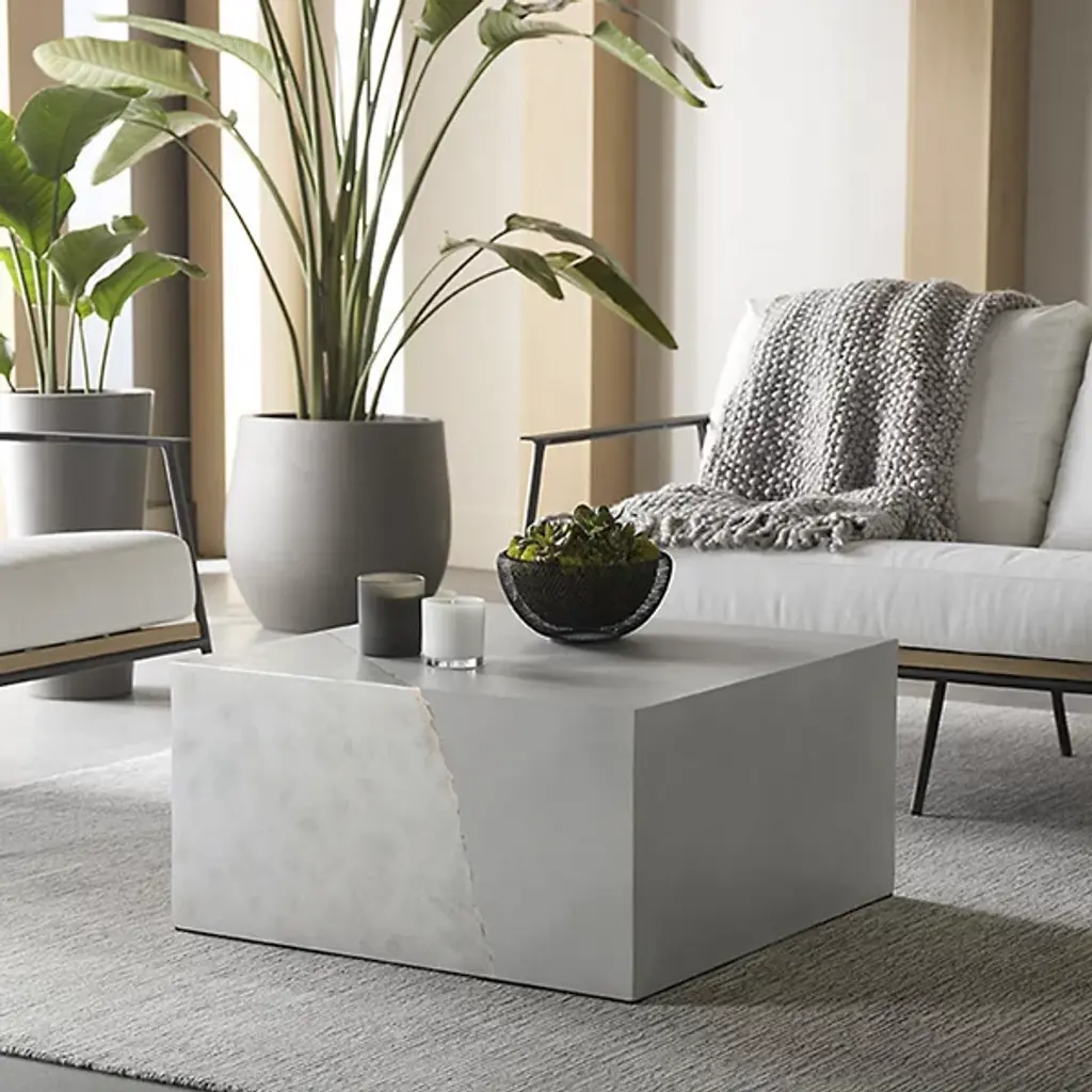 The Kyson Coffee Table from Sunpan blends rugged charm with contemporary sophistication, making it a striking focal point for any living space. Crafted from natural grey concrete, it features a unique painted silver foil tear pattern that adds an artistic and modern touch. The minimalist design and bold material choice create a perfect balance of style and functionality, making this coffee table ideal for enhancing both modern and industrial-inspired interiors.