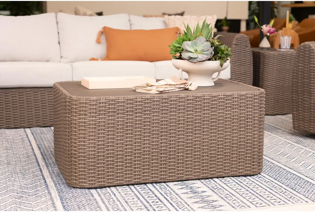 Five-star luxury is coming to your backyard patio with our La Jolla Brown Wicker outdoor coffee table. Featuring a shapely rounded silhouette with distinctive curves, the design boasts a rust-resistant aluminum frame wrapped in durable resin wicker for a high-end textural look. It is also topped by a faux wood composite. With all weather-resistant materials, this piece is made to last.