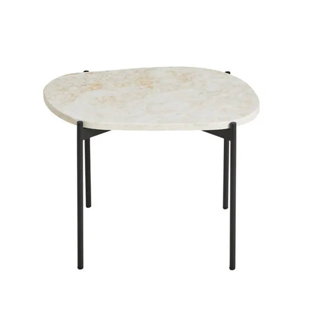*Due to the natural shape and material, size may very slightly from table to table The La Terra table is a harmonious and sophisticated addition to your home. Inspired by nature, the design beautifully embraces the organic shapes and muted colours of soft pebbles in the landscape. The infinite variants of the natural stones are reflected in the three smooth, floating shapes of the tabletop, which make a subtle contrast to the sleek crossing black metal frame. Made from travertine, every surface is unique as the play of colours varies in the natural material. Selected to bring a touch of nature and calm into any space. With three different available sizes and heights, the table can be placed as a single piece or entire landscapes can be created.