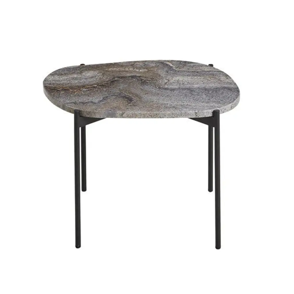 *Due to the natural shape and material, size may very slightly from table to table The La Terra table is a harmonious and sophisticated addition to your home. Inspired by nature, the design beautifully embraces the organic shapes and muted colours of soft pebbles in the landscape. The infinite variants of the natural stones are reflected in the three smooth, floating shapes of the tabletop, which make a subtle contrast to the sleek crossing black metal frame. Made from travertine, every surface is unique as the play of colours varies in the natural material. Selected to bring a touch of nature and calm into any space. With three different available sizes and heights, the table can be placed as a single piece or entire landscapes can be created.
