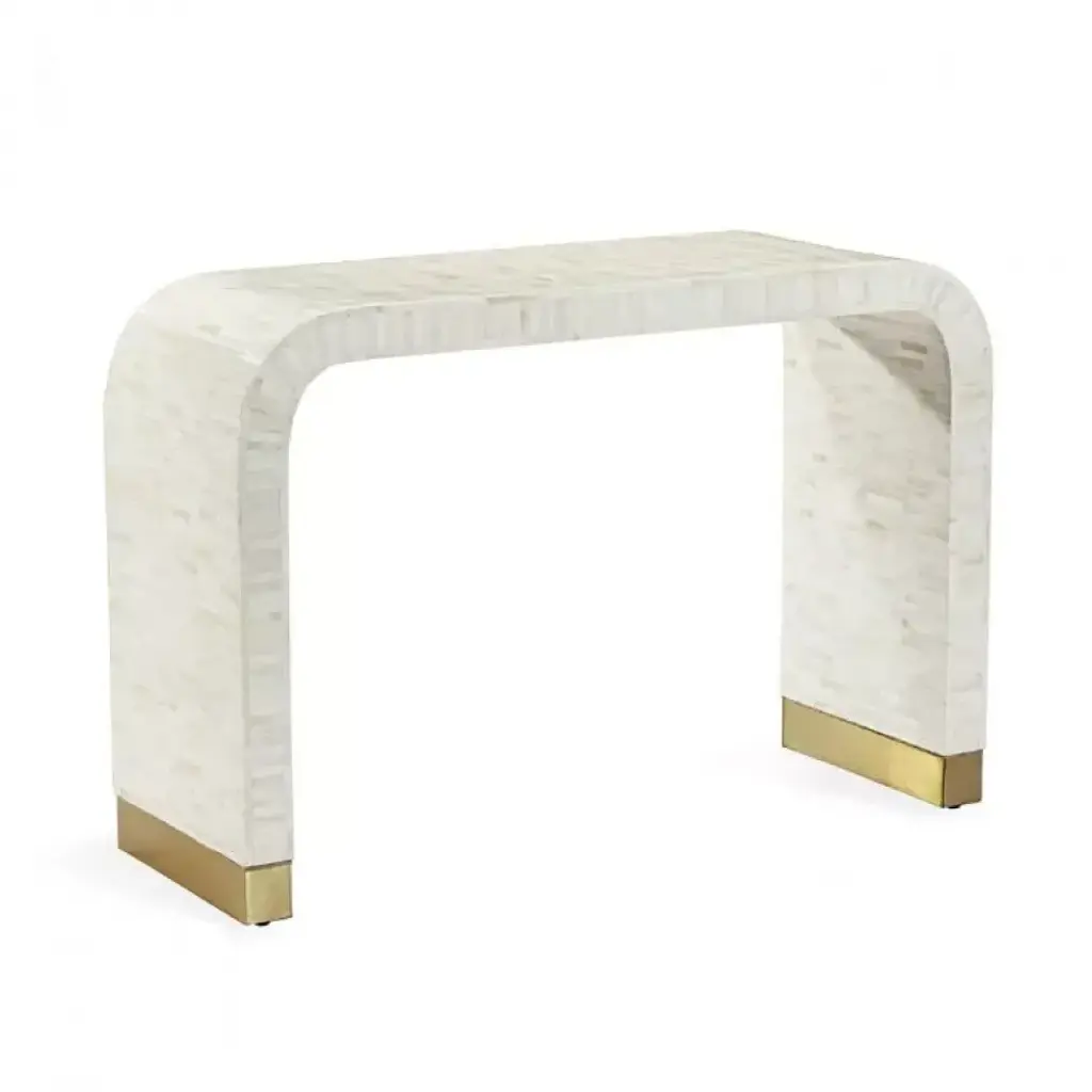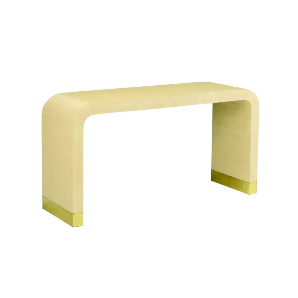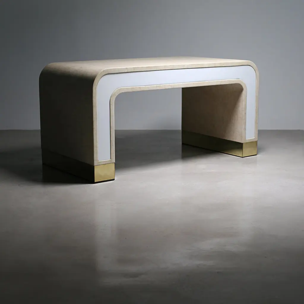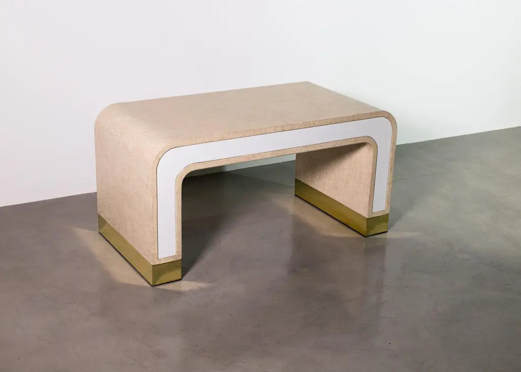 This waterfall style one-of-a-kind table features two natural lacquered linen surfaces that run unseamed from end to end, finished with bronze feet, and separated by a lacquered wood accent. Shown here in white, it can be finished in any color or species of wood. Also available in goatskin, leather, or COM and in custom sizes. In stock in NY and available for immediate delivery.