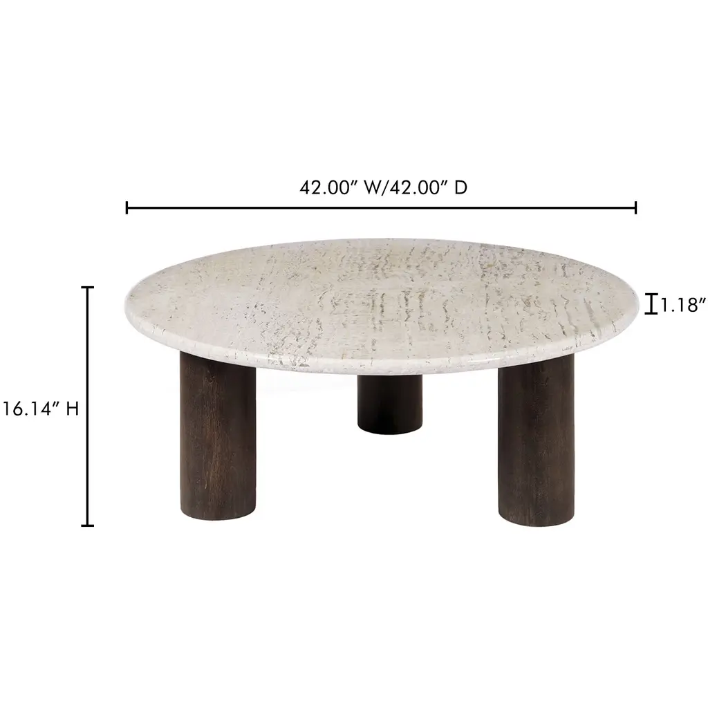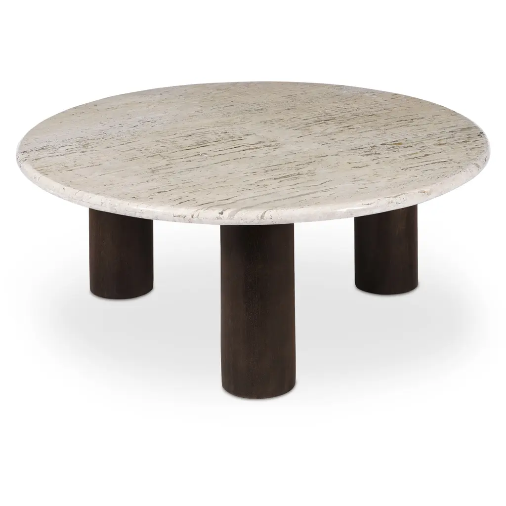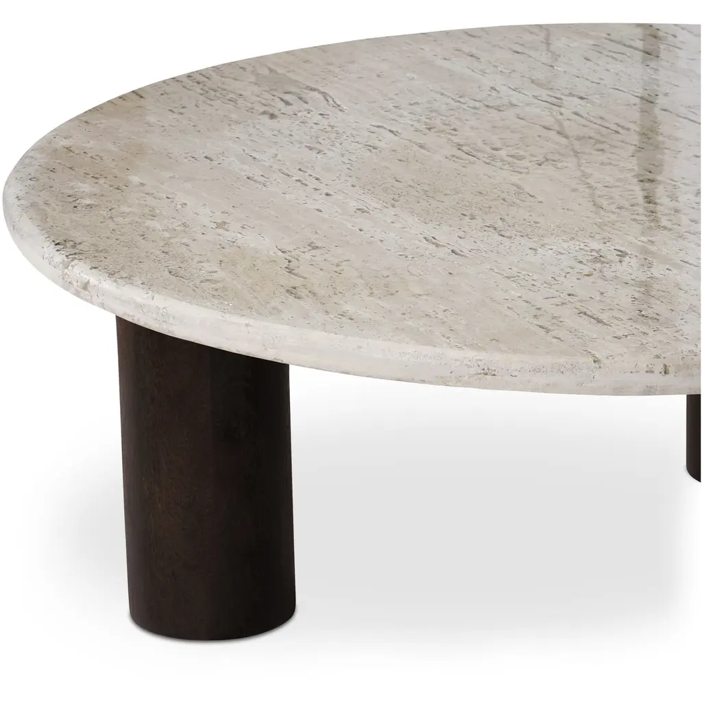 The Landon coffee table encapsulates design and proportion, crafted with a generous 30mm-thick Turkish travertine tabletop and a mango wood base stained in a rich, dark hue. The rounded tabletop edge gives the travertine a soft feeling, while the darkly stained mango wood base adds warmth to the hardened material. Note that no two tables are alike, showcasing their own color and veining variation.
