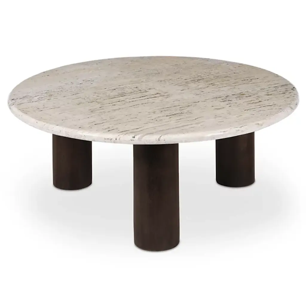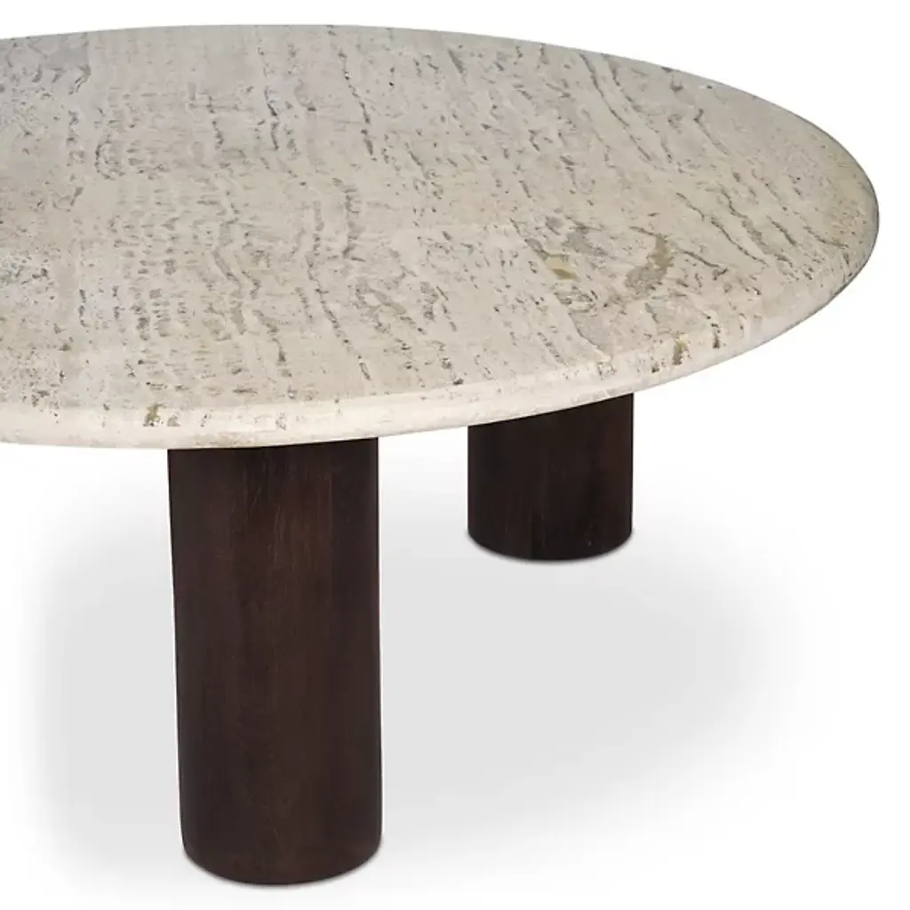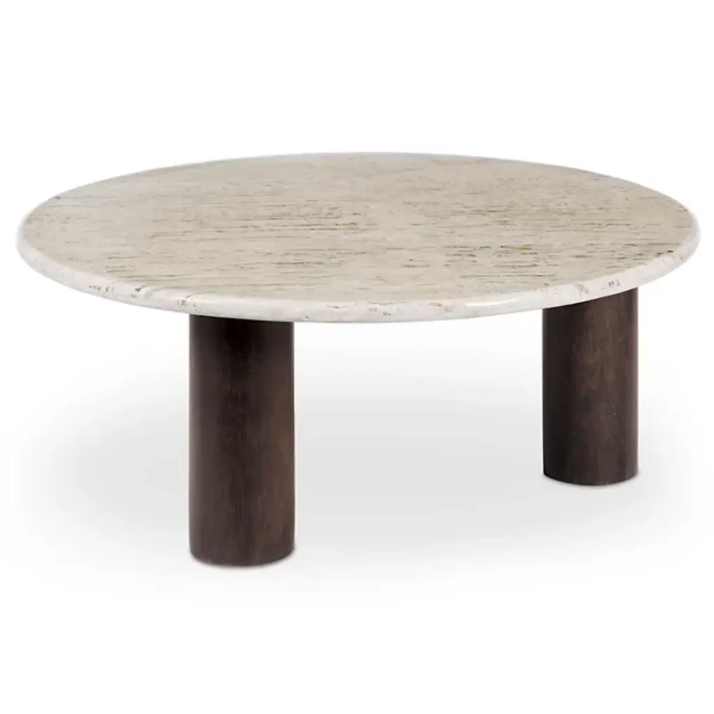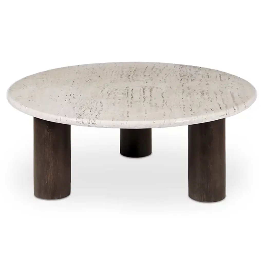 The Landon Coffee Table from Moe's Home Collection exemplifies a balance of considered design and careful scale of pieces. Made in India, it sets a substantial, circular Turkish travertine top atop a dark-stained mango wood base. The softly rounded edges of the travertine lend a gentle touch, while the dark wood base provides warmth. Each table is distinct, with unique colors and veining patterns, and the mango wood columns are made from trees that no longer produce fruit. The trees are chosen for maximum sustainability and ecological consciousness, highlighting contemporary style and natural beauty.
