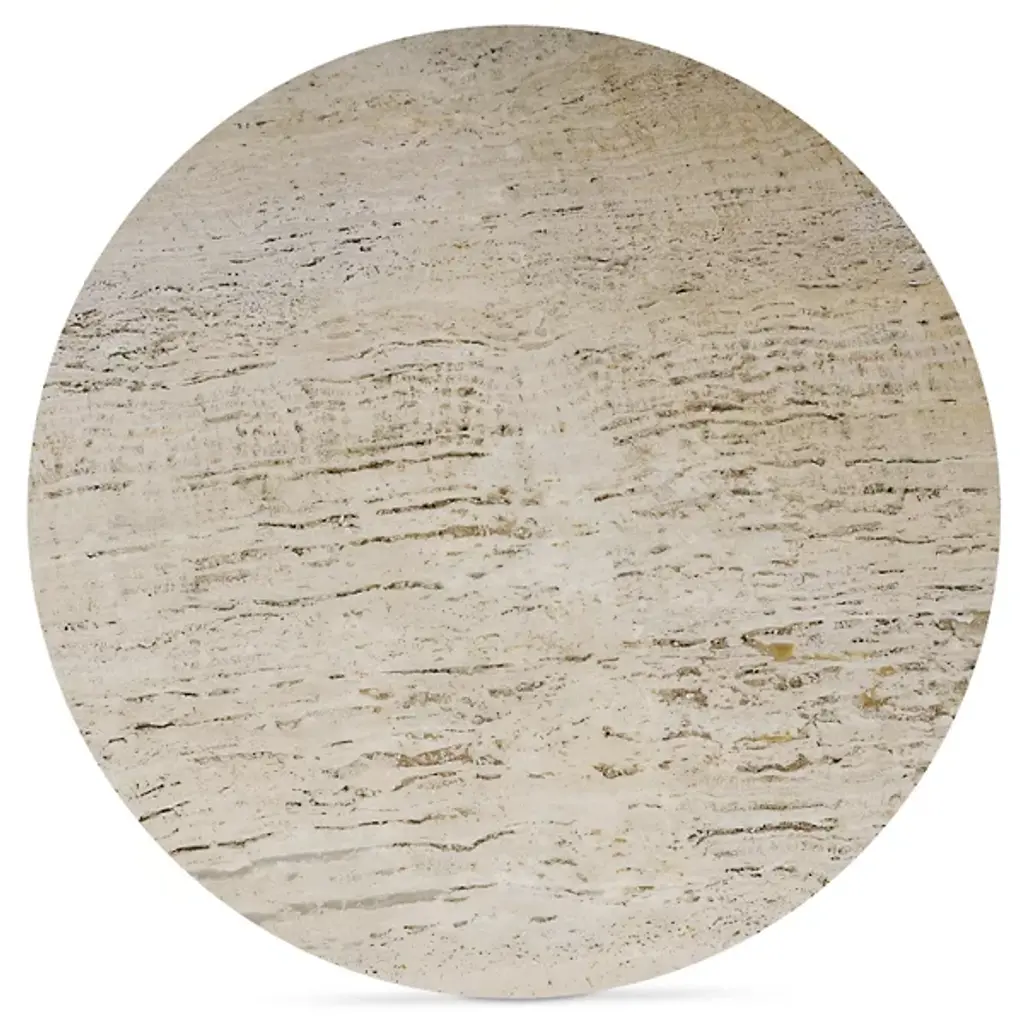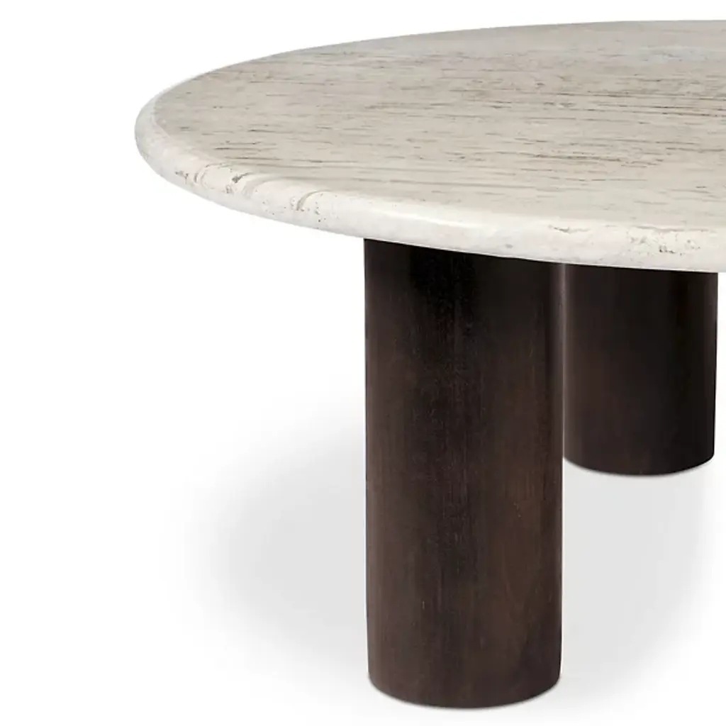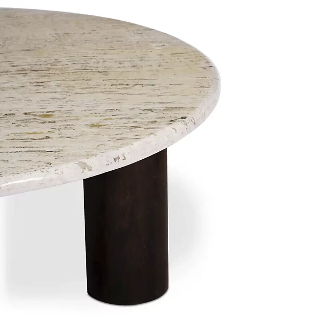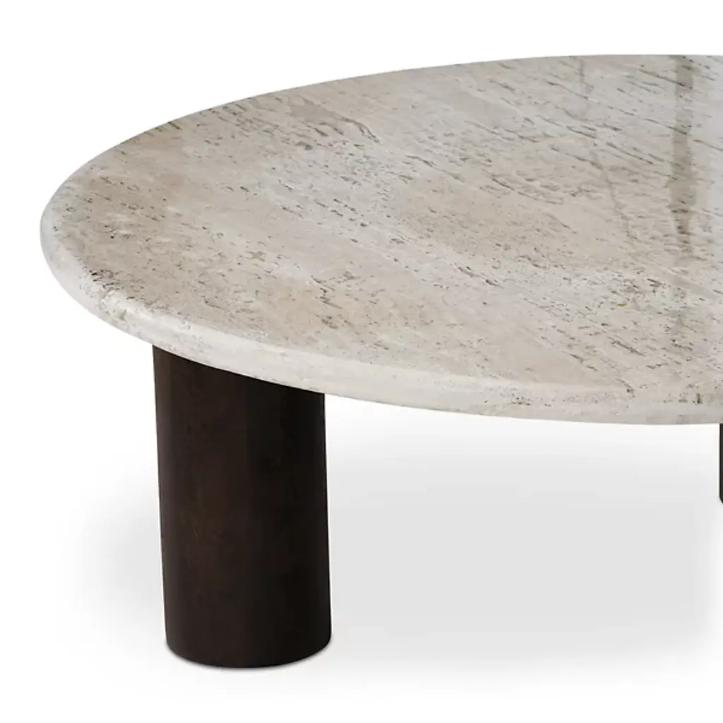 The Landon Coffee Table from Moe's Home Collection exemplifies a balance of considered design and careful scale of pieces. Made in India, it sets a substantial, circular Turkish travertine top atop a dark-stained mango wood base. The softly rounded edges of the travertine lend a gentle touch, while the dark wood base provides warmth. Each table is distinct, with unique colors and veining patterns, and the mango wood columns are made from trees that no longer produce fruit. The trees are chosen for maximum sustainability and ecological consciousness, highlighting contemporary style and natural beauty.