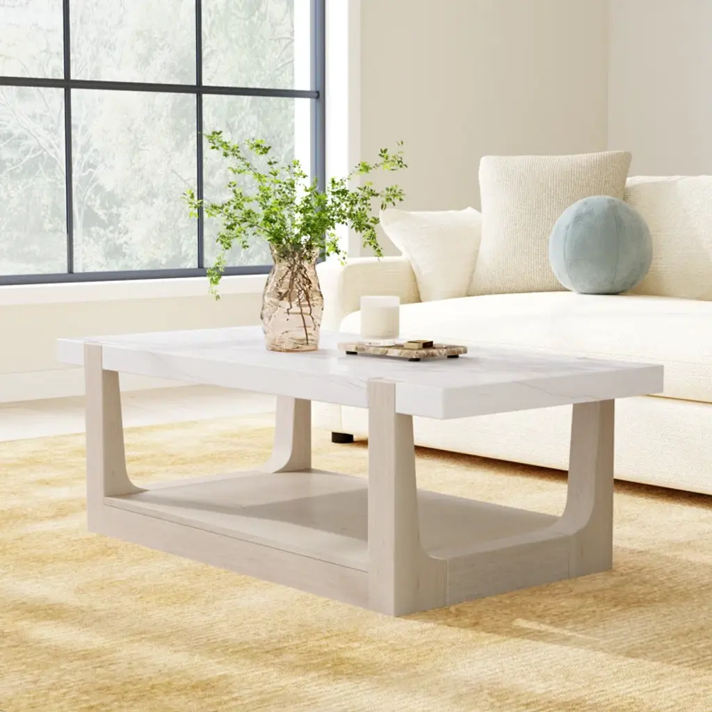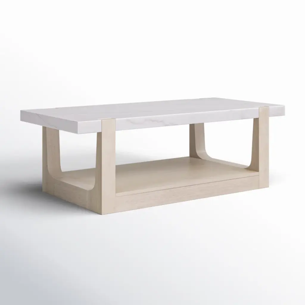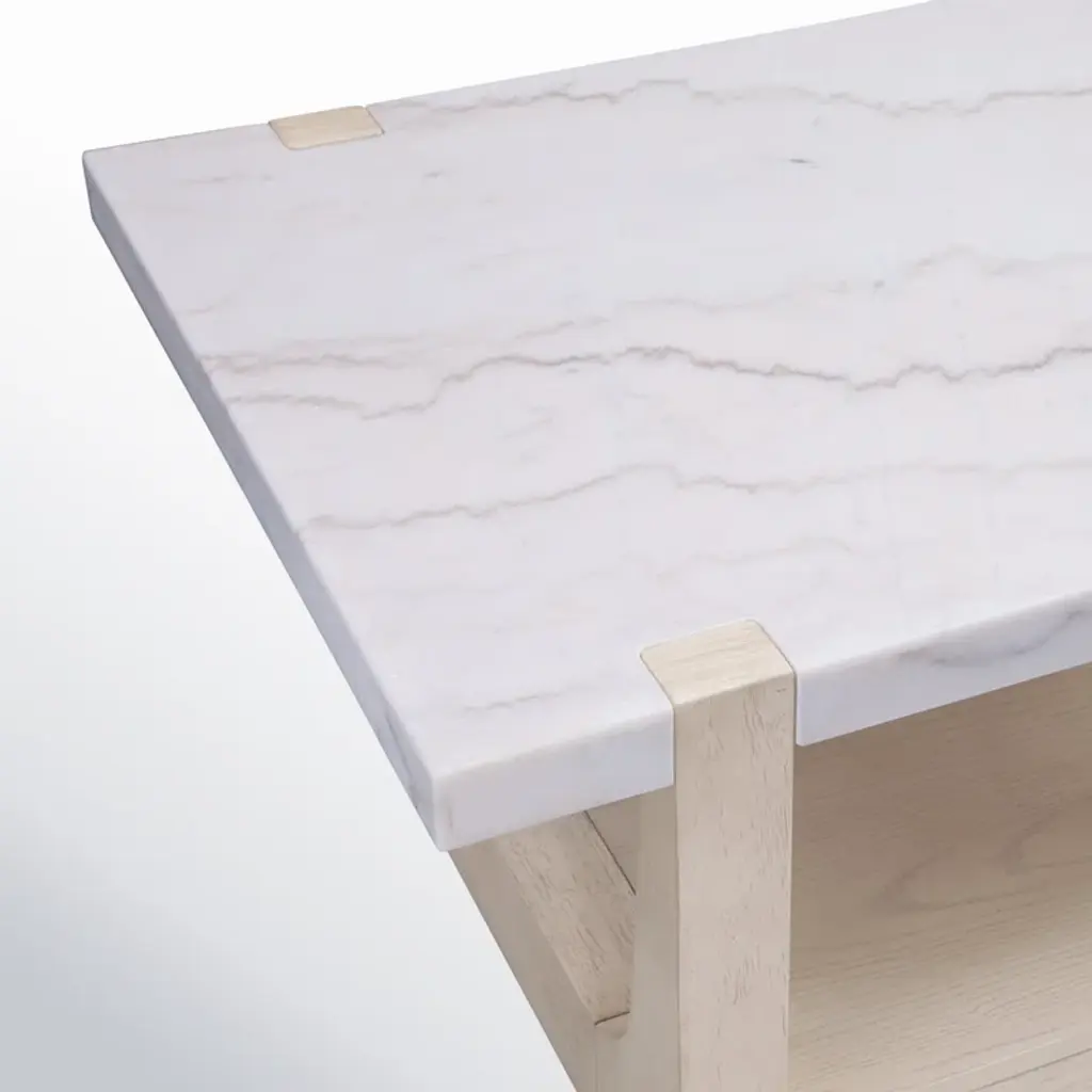 This coffee table combines sleek, modern style with bold materials. The top is made from genuine white marble with gray veining, while the solid ash wood base provides a sturdy foundation. The lower shelf offers handy storage. Pair it with matching pieces for a cohesive look in your space.