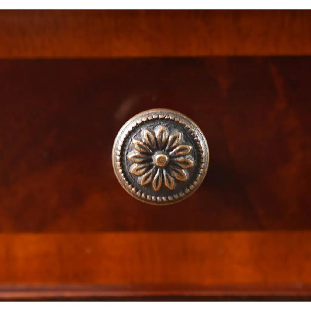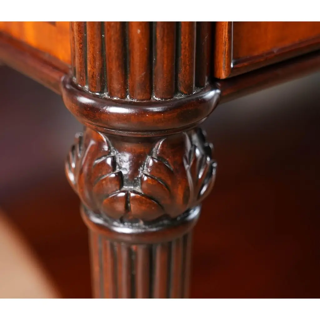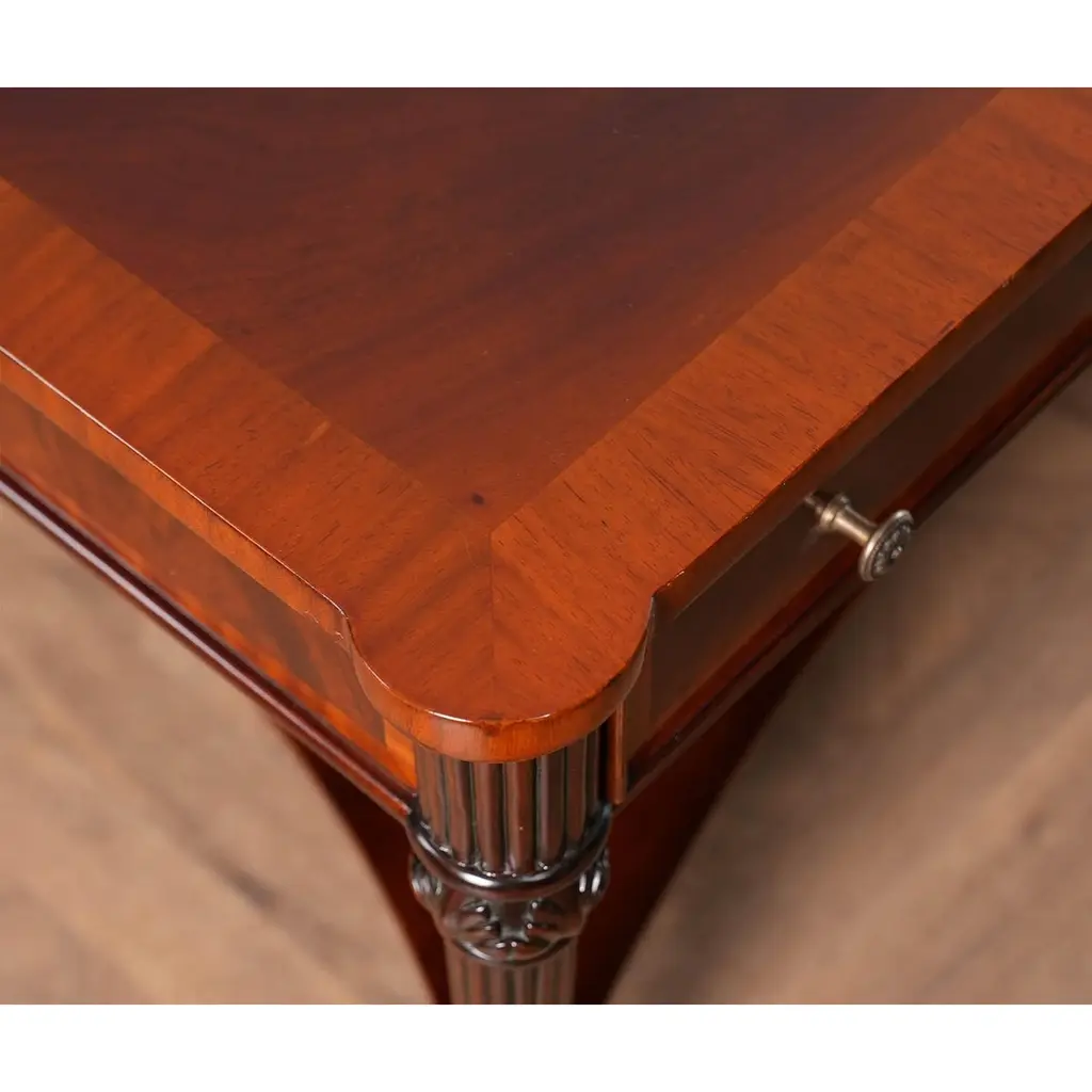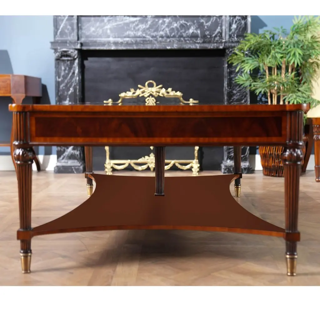 A Large Coffee Table from Niagara Furniture with all of the bells and whistles including four drawers, reeded legs, solid brass capped feet and cookie shaped, rounded corners. Great quality construction and attention to detail make this a substantial piece of furniture ideal for the larger living space in many newer homes and offices.Measures 60″w x 32″d x 20.5″h metric 152 81 53