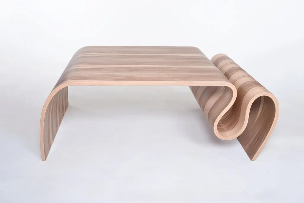 The design of this table is very unique and unusual, it would be a great touch of modernity in your home design.This coffee table is made with laminated bent plywood, Sweet Gum veneer.Overall e: 16" H x 48" W x 30" D