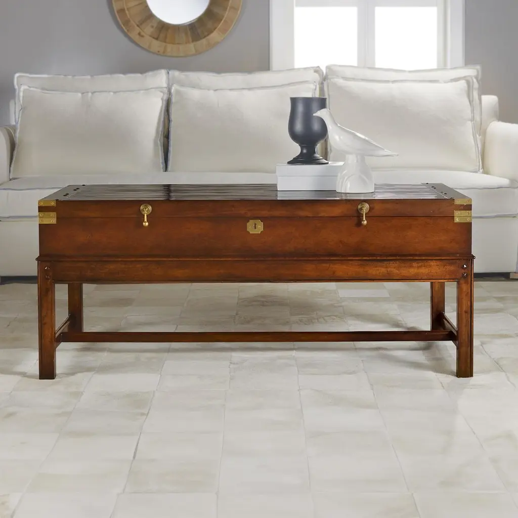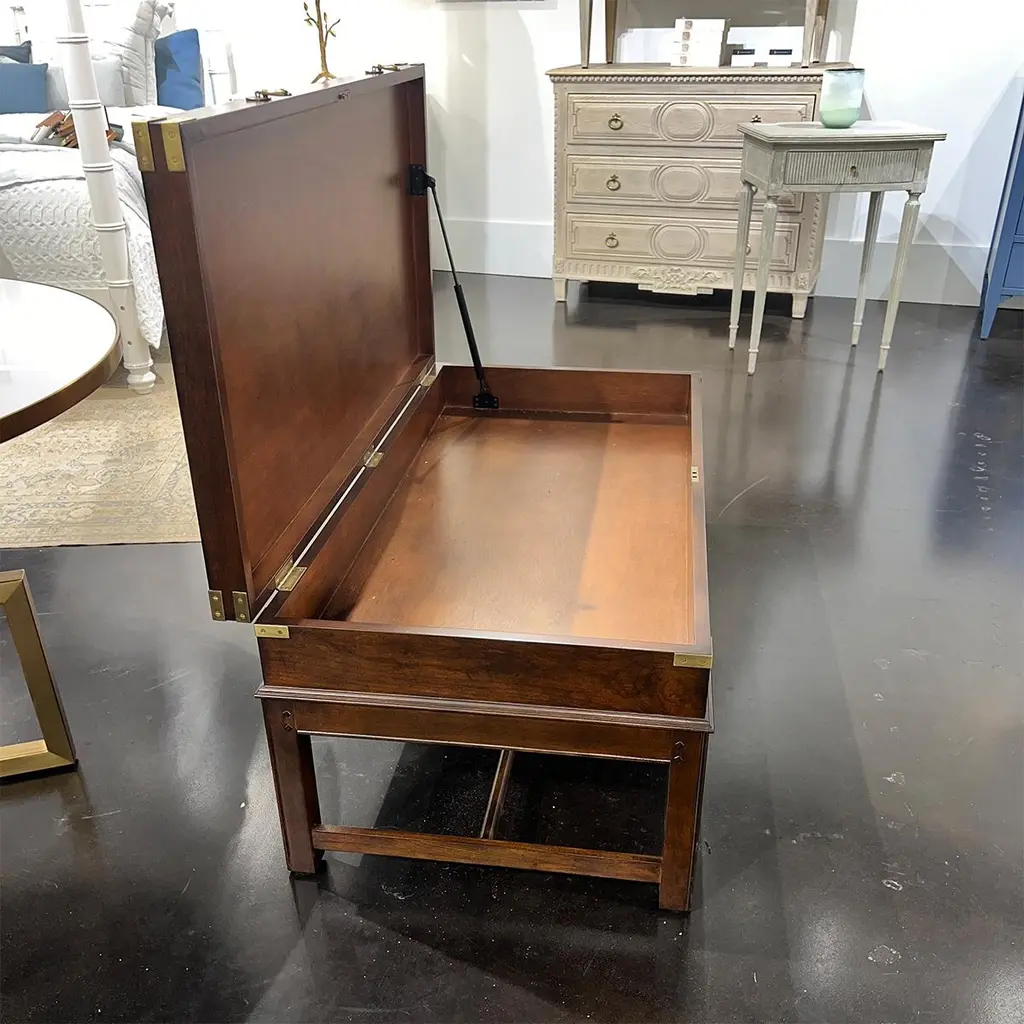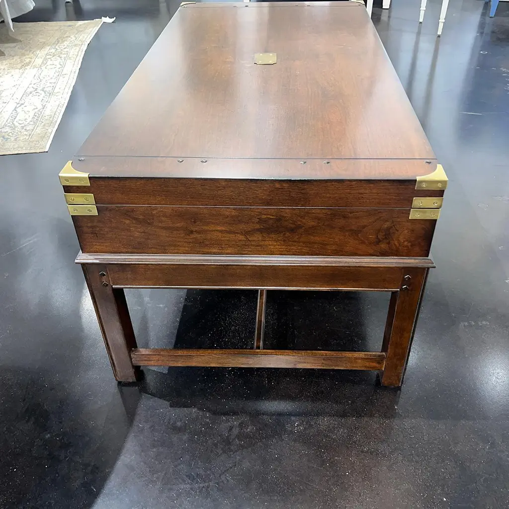 In the antique English Campaign style. The large lift-top wooden coffee table provides ample storage in a unique traditional style. With brass mounts and pulls. Raised on a Georgian style molded edge H form stretcher base. Dimensions: 48.75" W x 25" D x 20.25" H