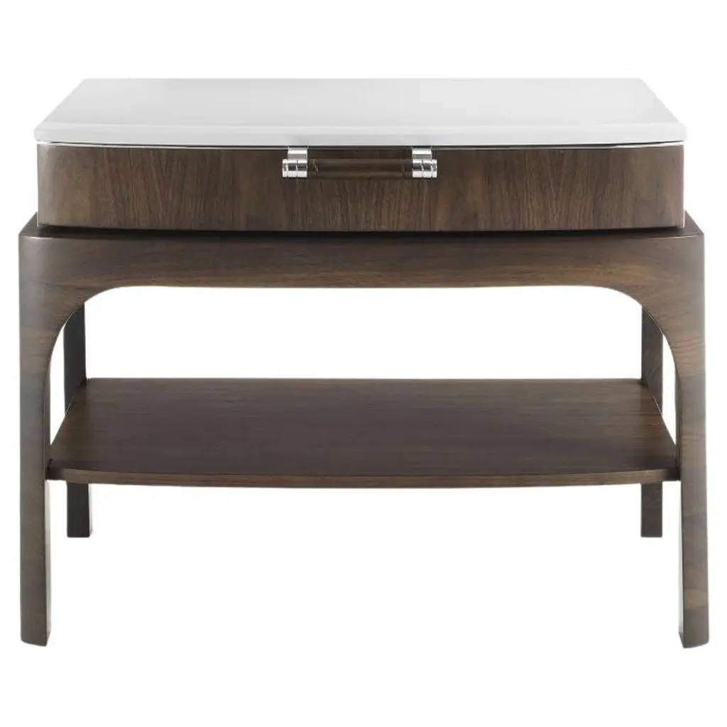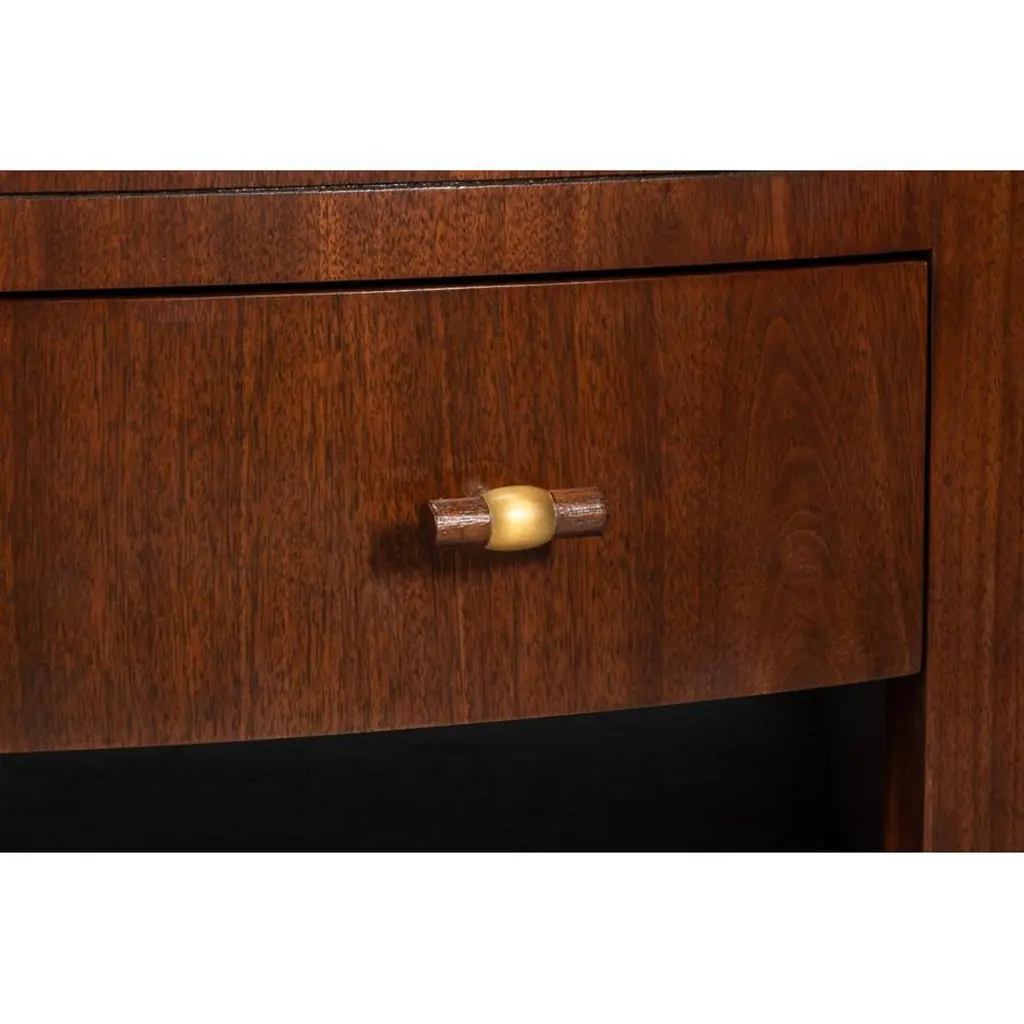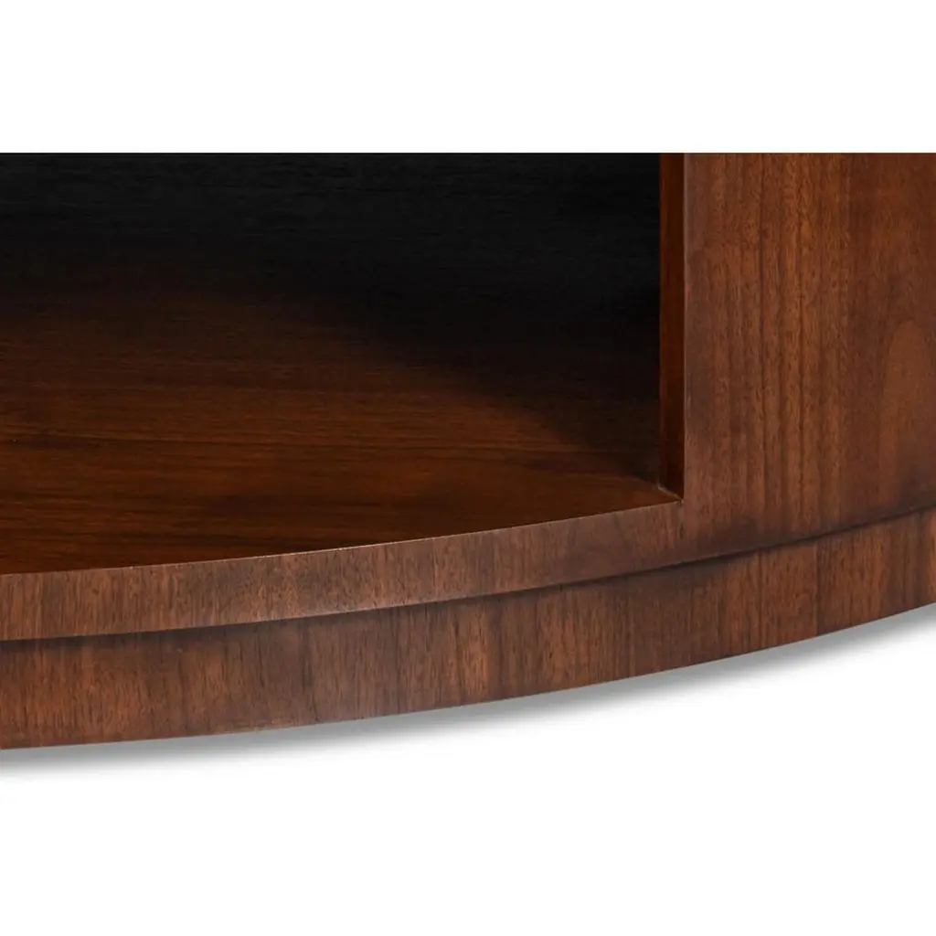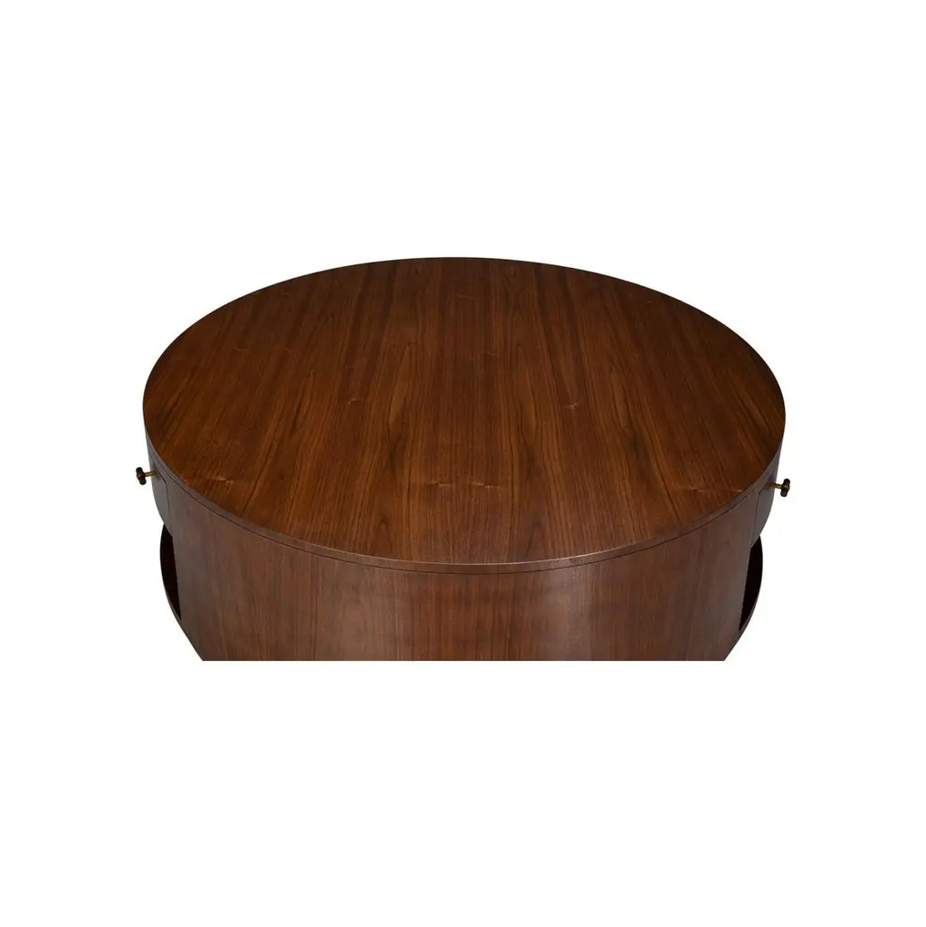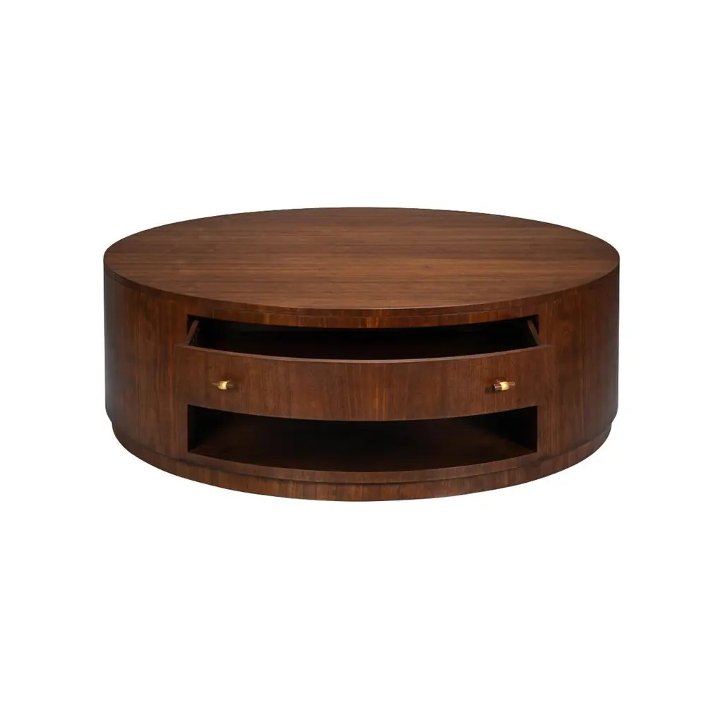 Round coffee table combines timeless design with everyday functionality. Crafted in a warm walnut finish, this striking piece features a bold circular form that anchors any living room with sophistication. Its expansive 56-inch diameter offers ample surface area, making it ideal for entertaining or displaying decorative accents.Thoughtfully designed with two drawers and an open shelf, it provides discreet storage for remotes, books, or essentials while maintaining a clean, seamless profile. Perfect for spacious interiors, this table blends mid-century inspiration with practical versatility, serving as both centerpiece and storage solution.Dimensions: 56" Dia x 22" H