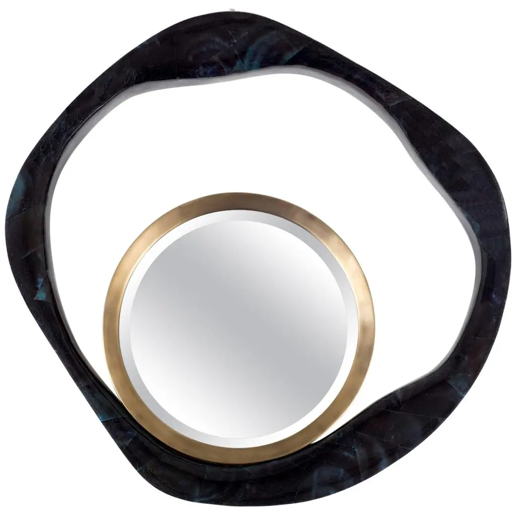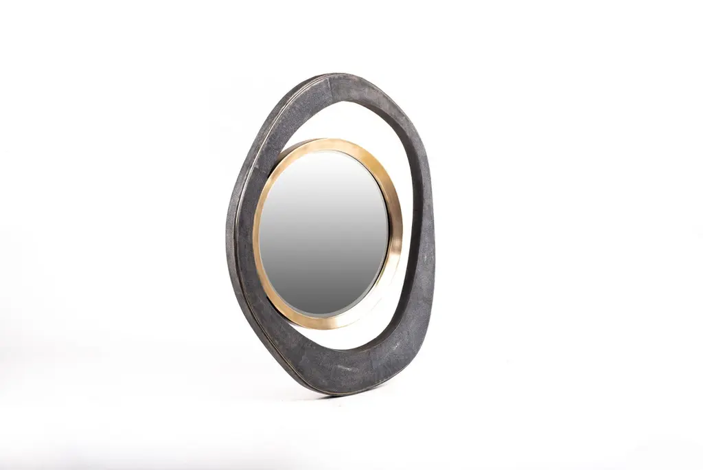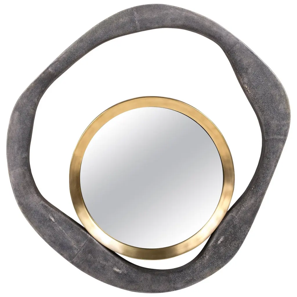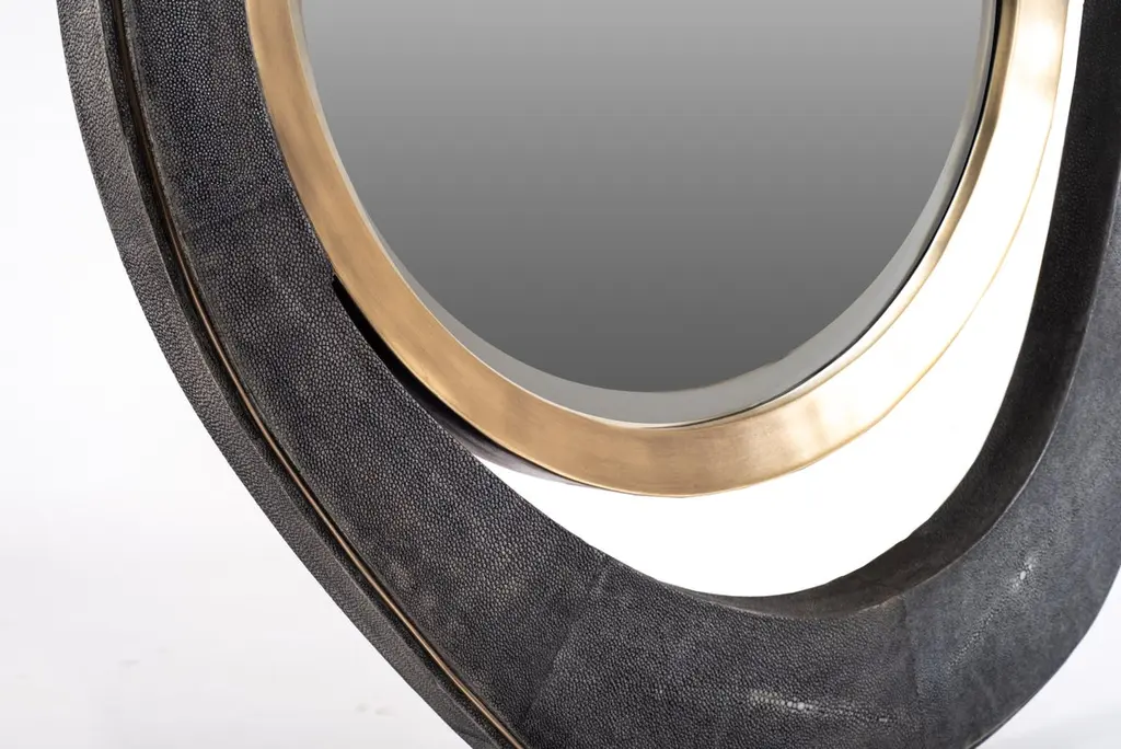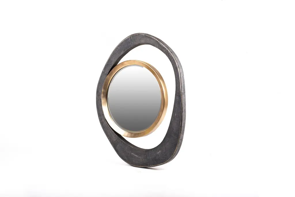 The Paris based label has distinguished themselves since their launch, with their iconic use of shagreen mixed with brass and other exotic materials. All furniture is handcrafted by skilled artisans, ultimately making each piece unique, designed in Paris and produced in the Philippines.The peacock mirror in coal black shagreen and bronze-patina brass details is inspired by R&Y Augousti’s iconic nesting coffee tables is the perfect accent piece to dress up any wall. Available in a medium size. The finish of the shagreen is authentic as it is hand-dyed and the designer calls the finish look: "coal black shagreen."The dimensions of this piece are 86 x 70 x 4.5 cm / 34" x 27.5" x 2"All R&Y Augousti pieces are handmade by artisans, ultimately making each piece unique. Custom color/sizing available on request. Wipe clean with soft dry cloth.Acclaimed design duo Ria & Yiouri Augousti have established themselves since the 1990’s as pioneers of modern-vintage style through their luxurious Art Deco inspired collections.The Paris based label has distinguished themselves since their launch, with their iconic use of shagreen mixed with brass and other exotic materials. All furniture is handcrafted by skilled artisans, ultimately making each piece unique. All shagreen-covered items should be kept out of direct sunlight, color variants may occur on the stingray and other exotic finishes, but this showcases the Parisian label's commitment to creating authentic luxurious products using natural components.