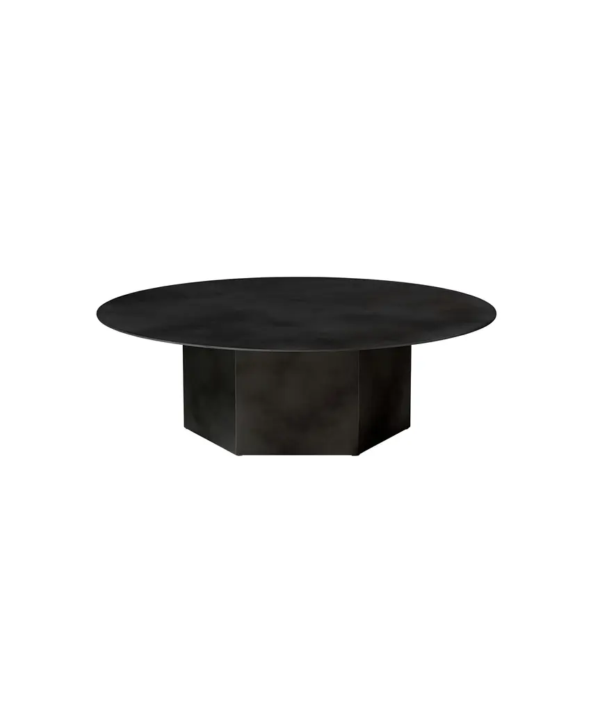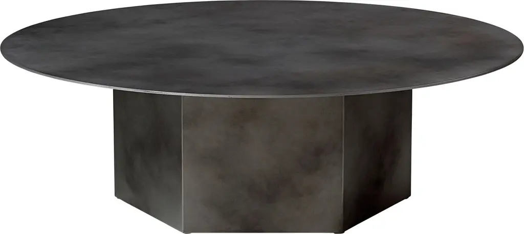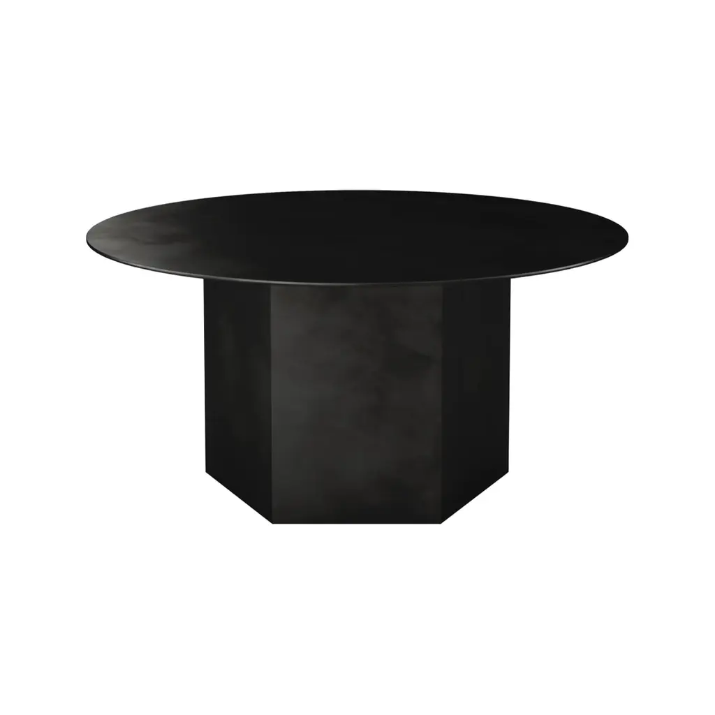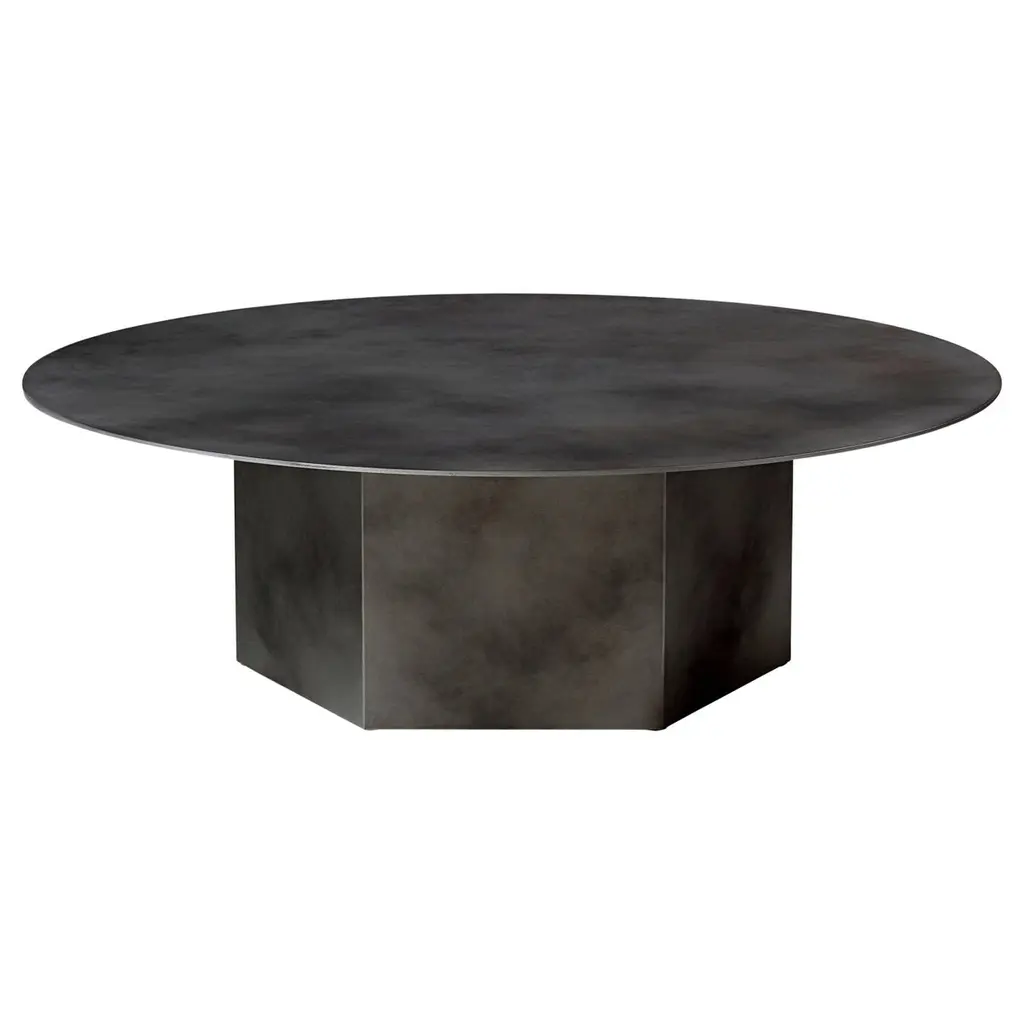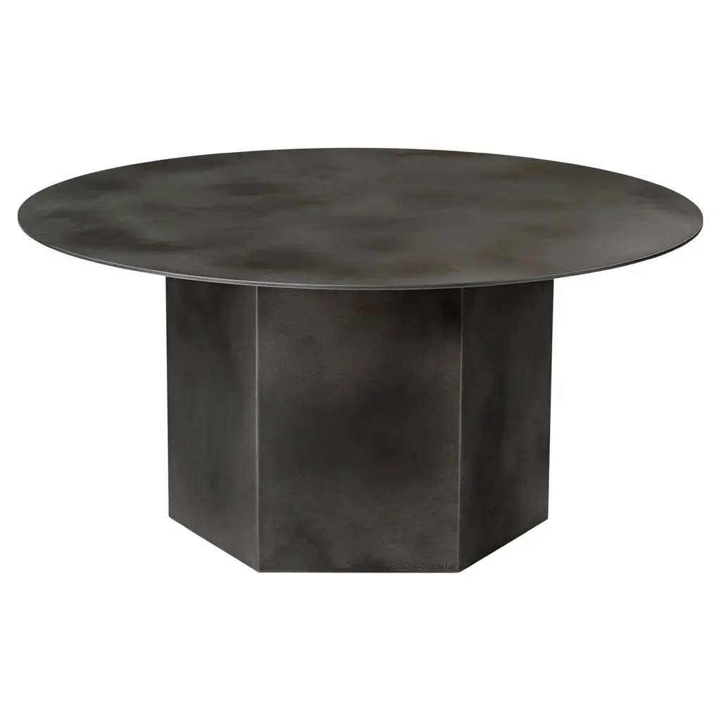 Large Steel 'Epic' Coffee Table in Midnight Black by Gamfratesi for GubiDesigned by Danish-Italian duo GamFratesi, the Steel 'Epic' Table series for GUBI is executed in solid steel. The metal is galvanized, lacquered, and hand-finished to create a contemporary take on classical architectural elements. The hexagonal base and a circular top combine to create a striking sculptural piece that carries a subtle reference to the iconic columns of Ancient Greece. The varying heights and diameters and finishes within the 'Epic' Table Collection mean a single monochromatic table can stand alone or be combined in dynamic clusters of differing material, height and color.Price is per item. Available in unlimited quantities in misty grey or midnight steel. This listing is for the large 'Epic' cofffee table in midnight black. In-stock lead time 12-16 weeks. Out of stock can add additional 12 weeks or more. For time-sensitive projects, kindly inquire prior to purchasing.Please note that these pieces must ship directly from GUBI's order fulfillment warehouse, so 1stDibs shipping, white glove delivery, or local pickup is not an option. Shipping cost quoted is per item and cannot be combined.Made to order. All sales final.