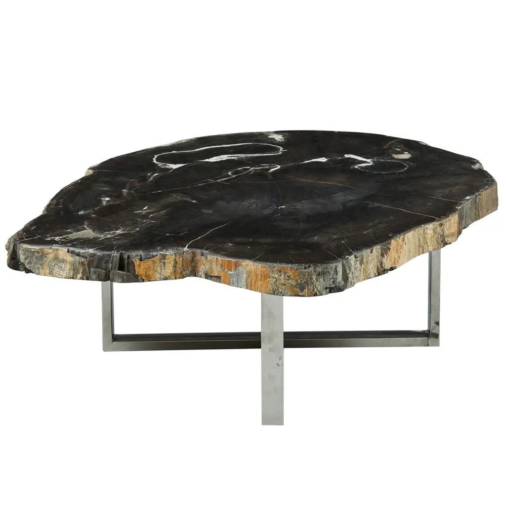 A one of a kind piece, the Larza Table offers the perfect balance of organic elements with sleek modern design. These unique tops are constructed from petrified wood slices that have been sanded and polished, accentuating their natural color variations and distinct patterns. It sits atop a clean geometric stainless steel base.