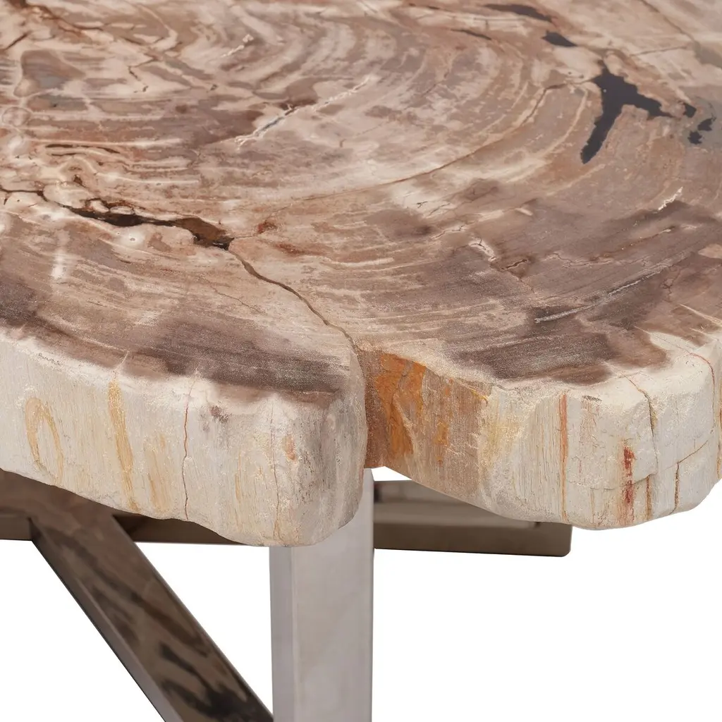 A one of a kind piece, the Larza Table offers the perfect balance of organic elements with sleek modern design. These unique tops are constructed from petrified wood slices that have been sanded and polished, accentuating their natural color variations and distinct patterns. It sits atop a clean geometric stainless steel base.