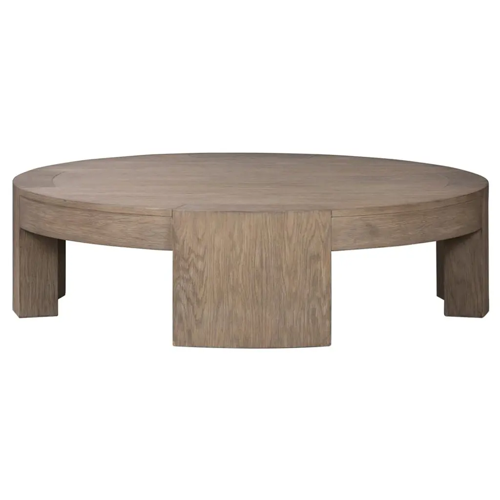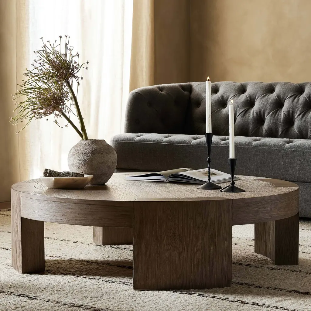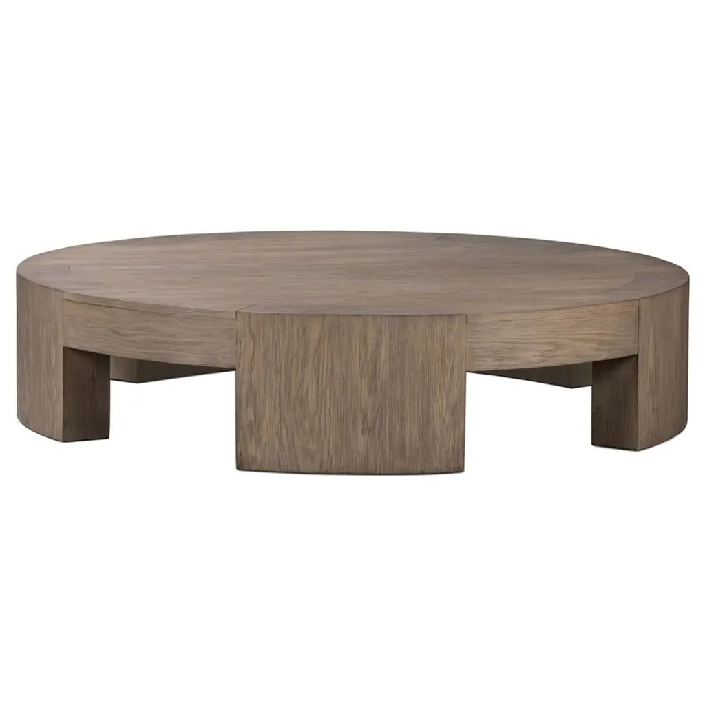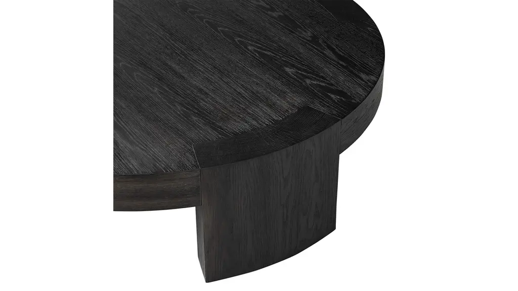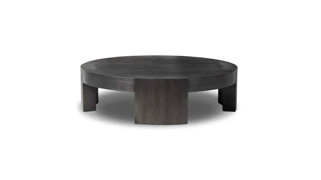Made from thick, natural oak or charcoal-finished oak, a rounded coffee table features five legs that pull through to the top, for an intriguing design detail. Made in Vietnam.