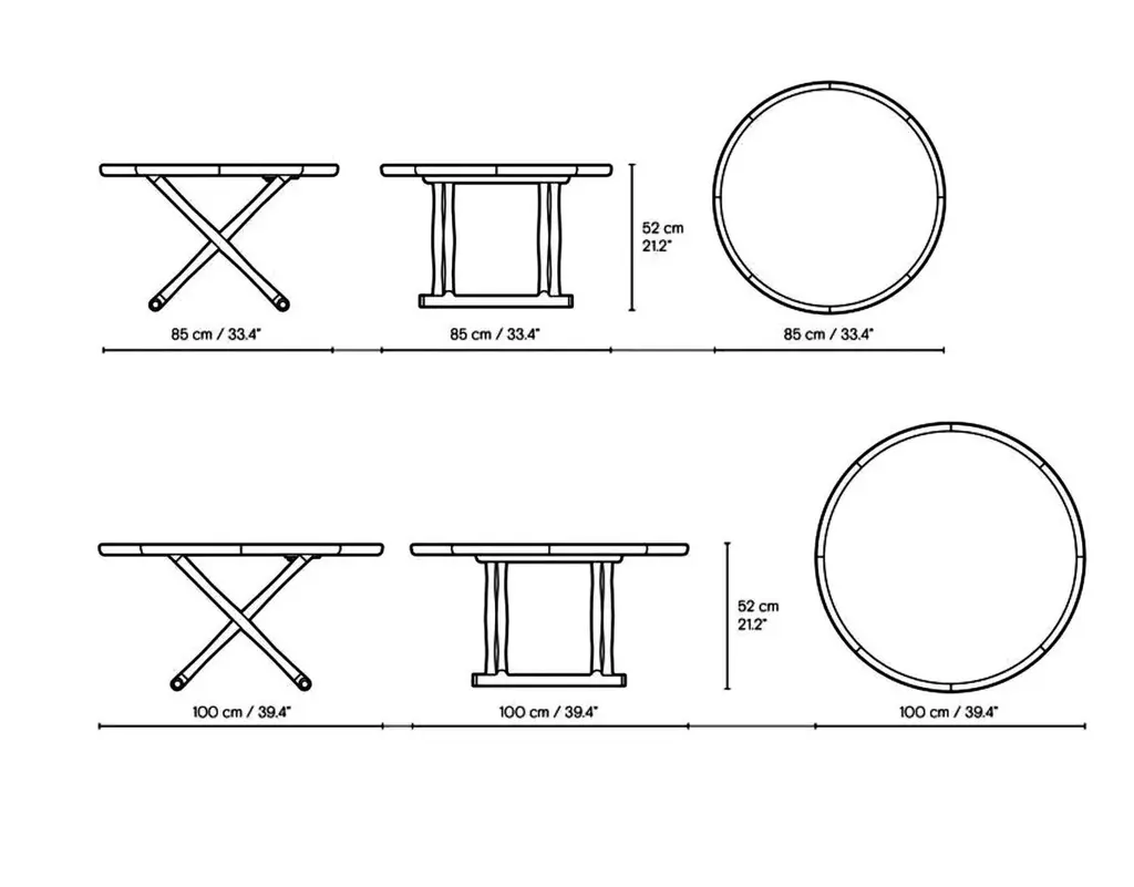 Lassen 'ML10097' Egyptian Coffee Table in Oiled Walnut for Carl Hansen & SonThe story of Danish Modern begins in 1908 when Carl Hansen opened his first workshop. His firm commitment to beauty, comfort, refinement, and craftsmanship is evident in iconic pieces designed by such legends as Hans J. Wegner, Arne Jacobsen, Kaare Klint, Poul Kjærholm, Vilhelm Lauritzen and others. Now in its third generation as a family run business, Carl Hansen & Son maintains its legacy through skillful work with the highest quality materials, sustainably producing Danish design classics by past icons and influential new designers.The 'ML10097' Egyptian Coffee Table was designed by Mogens Lassen to easily collapse for storage with the release of a small brass sliding latch beneath the tabletop. It is a flexible coffee table that exemplifies the functionalism present in classic furniture types.Price per item. Available in unlimited quantities in choice of oak or walnut with soap, oil, white oil, or lacquer finishes. Choice of 33.4" or 39.4" diameters. Prices vary. This listing is for the 'ML10097' Egyptian coffee table in oiled walnut with 33.4" diameter.In stock lead time 7-8 weeks. Out of stock lead times can add an additional 8-10 weeks or more. Please note that lead times, cost and inventory availability are subject to change without notice and dependent on choice of finish and material ordered. For time sensitive orders, please contact us for current lead times prior to purchasing.Please note that due to the organic nature of the wood, slight variations in color or grain can occur and will vary from piece to piece. Swatches should be seen as a guide; samples may be available upon request. Kindly contact us for more information.Made to order. All sales are final.