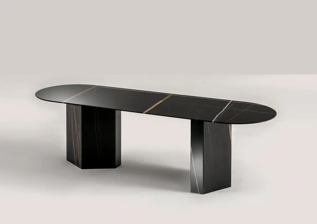 Low table with two hexagonal legs and elliptical top in Sahara Noir marble.Part of the Imperfetto Collection, they take up the modern design of the table from the same collection with elegance and style.Available in various sizes and shapes, they are available as made-to-Measure in multiple Laurameroni finishes, to guarantee maximum compositional freedom, but above all a beautiful and well-made product.Customization not available.