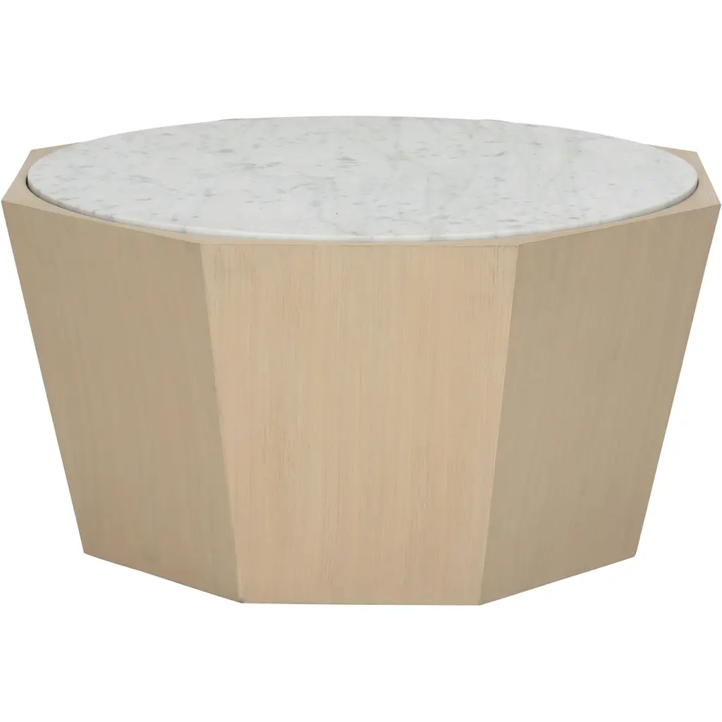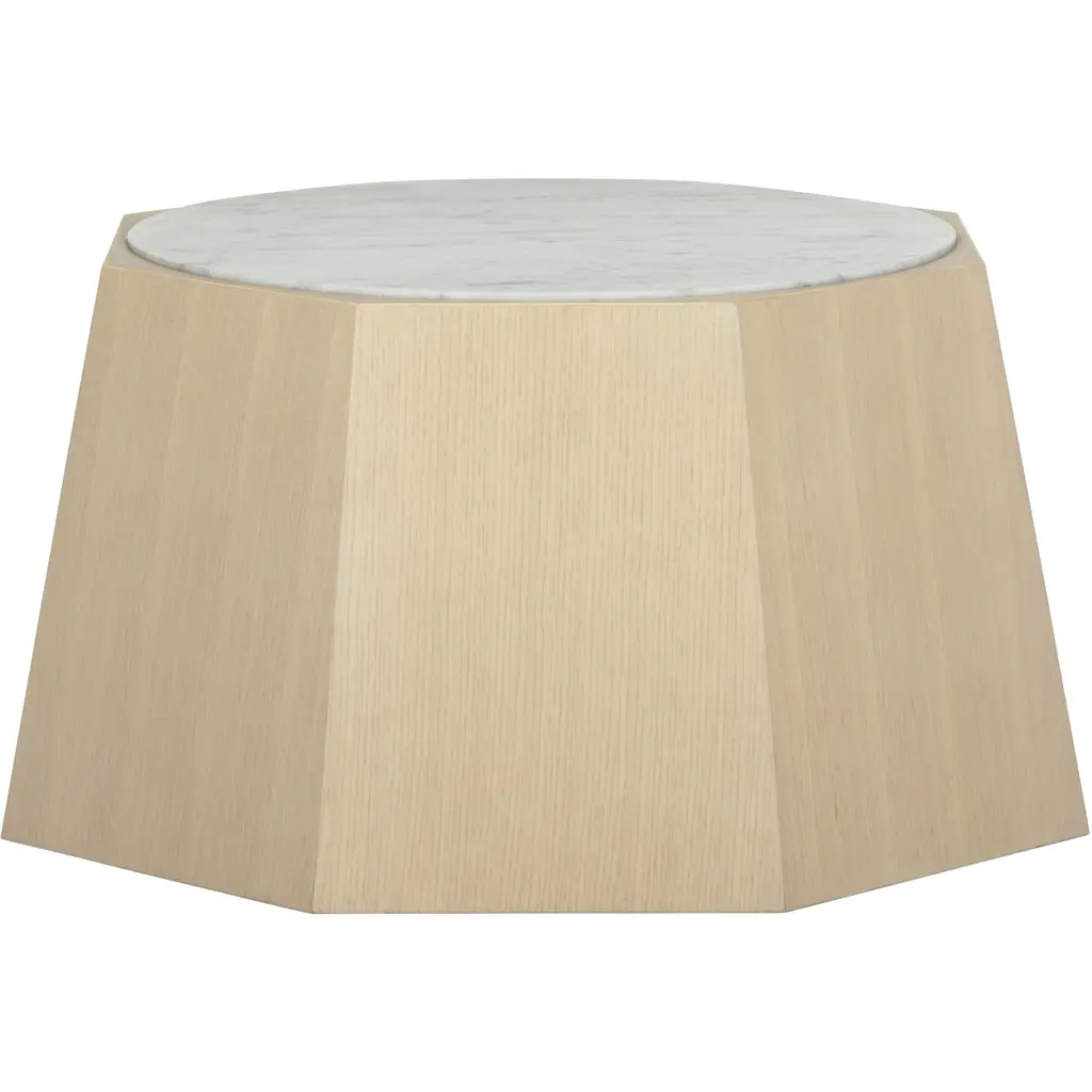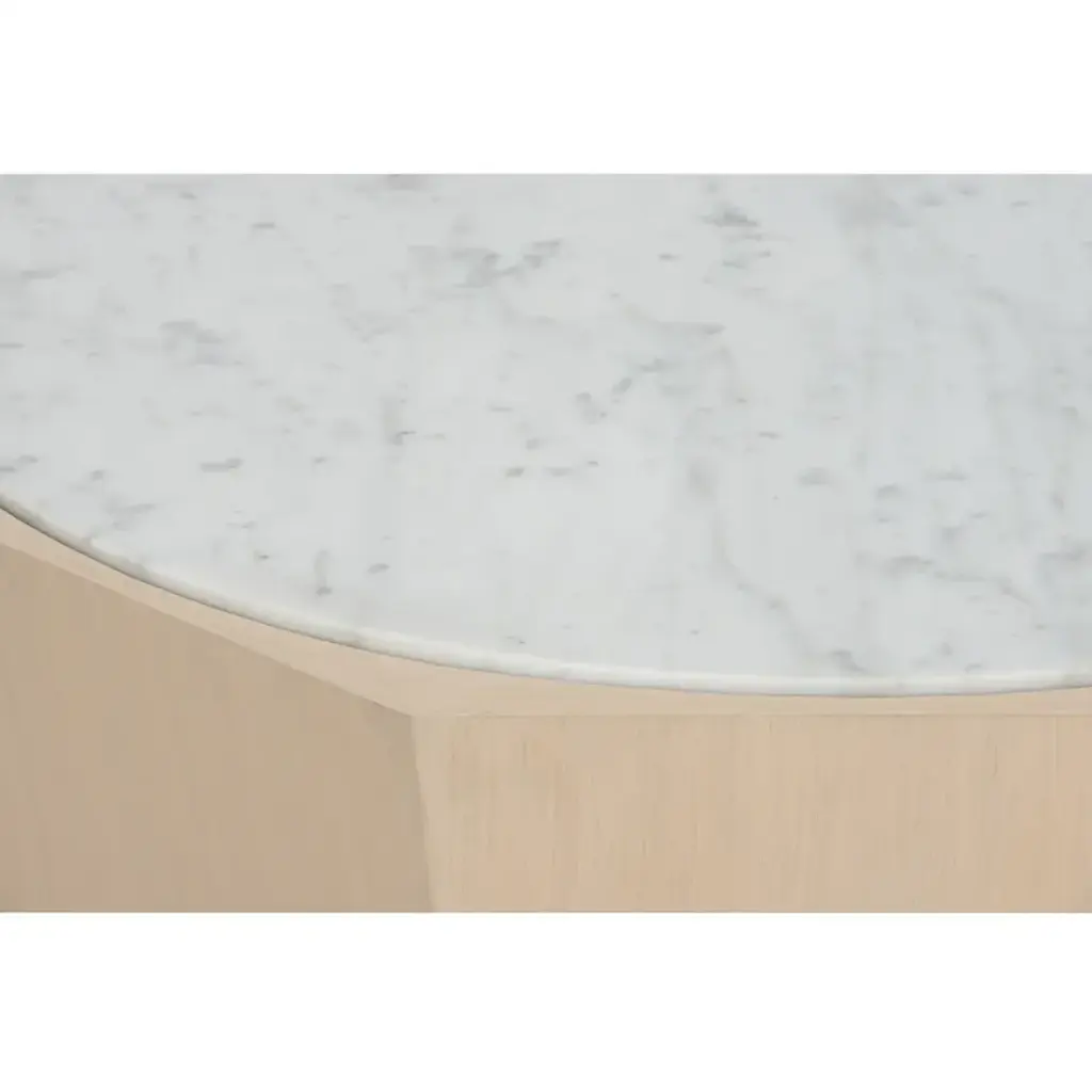 A thoughtfully elevated insert of honed Carrera marble rests perfectly atop a sculptural base of rift-cut white oak. The faceted body gives a sense of grounded luxury. Place the table with its counterpart to create an interlocking landscape of surfaces.