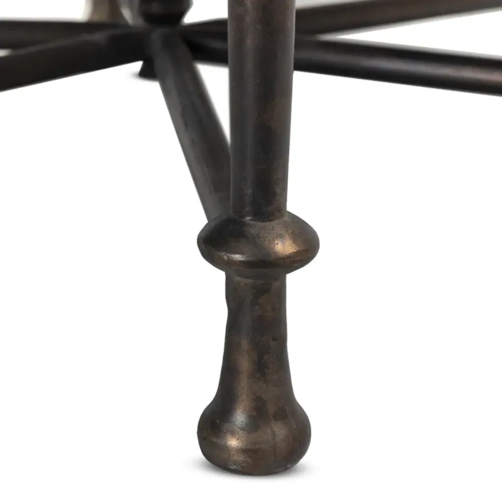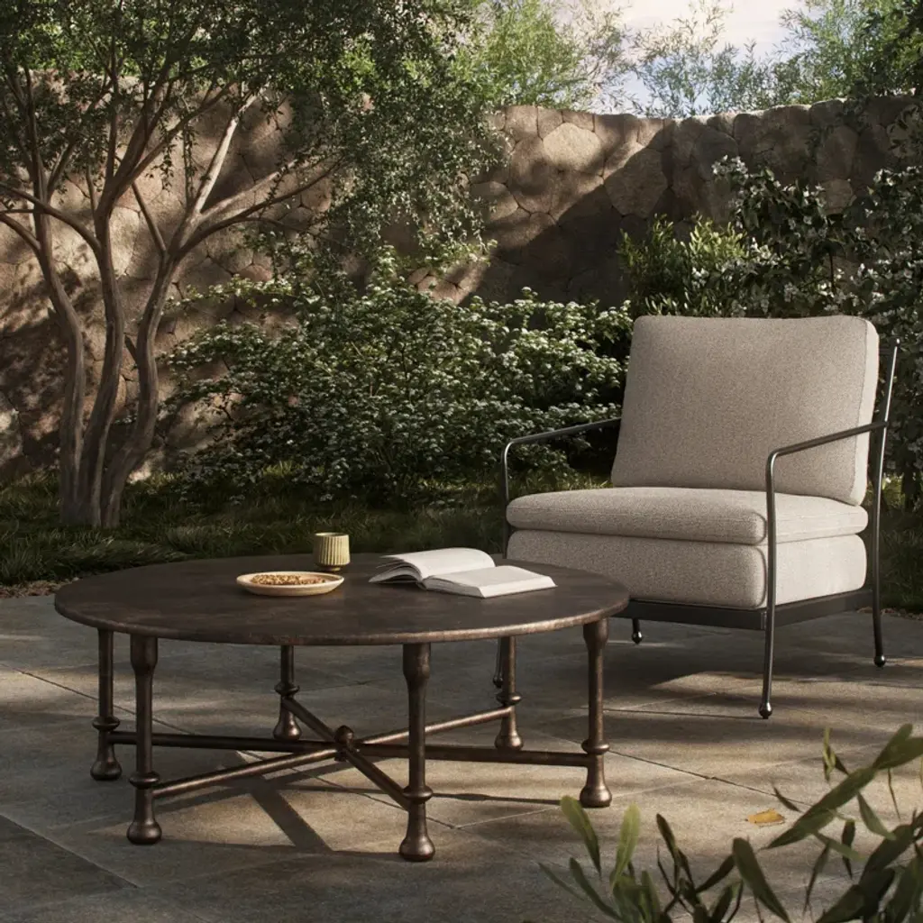 A design collaboration by Amber Lewis and Four Hands. Cast aluminum shapes this statement outdoor coffee table. Each of the six legs features turned detailing, finished in a distressed bronze that highlights the subtle movement of the material.