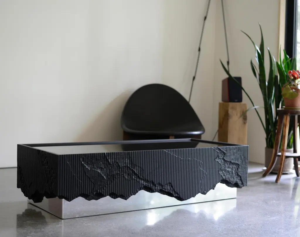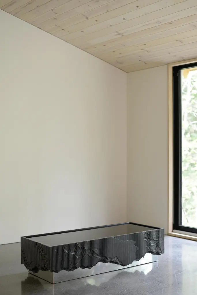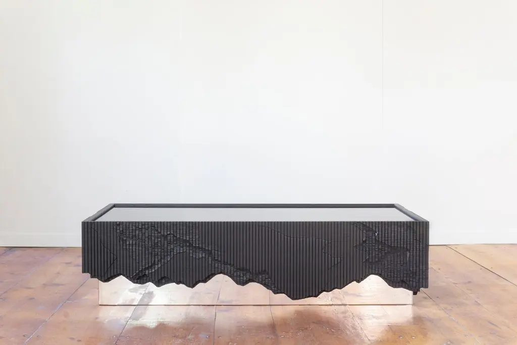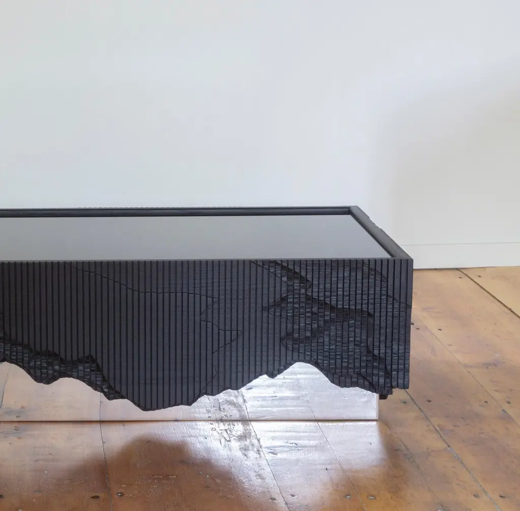 Ledge Coffee Table, is made of solid ash with a black glass top and a mirror polished base. It stems from material exploration inspired by cliffs around the studio, making solid ash reference crumbling stone through layered hand carving. The Shale and Ledge Collections' name was inspired by the cliffs outside Simon Johns' studio, in the Missisquoi Valley in Quebec. Shale is a type of rock formation that tends to split and erode in layers, leaving behind a layered and random composition of textures. The mapping of the composition of this cliff was sketched on to the pieces of the collection, and carved out in layers, with a router and a chisel.