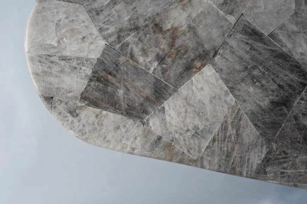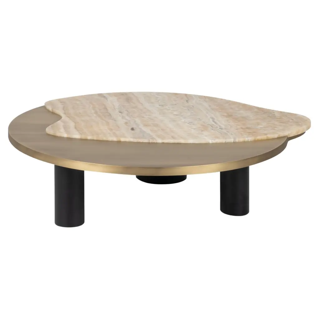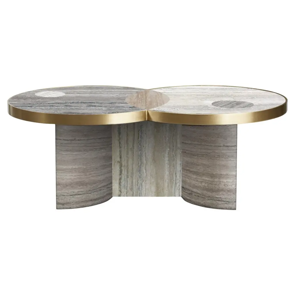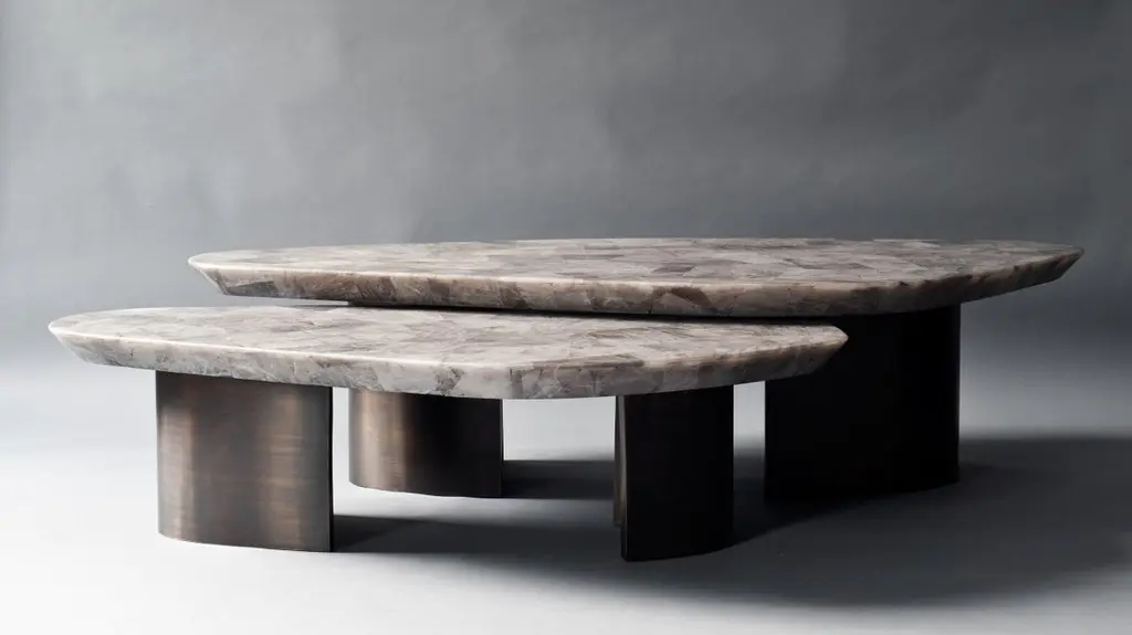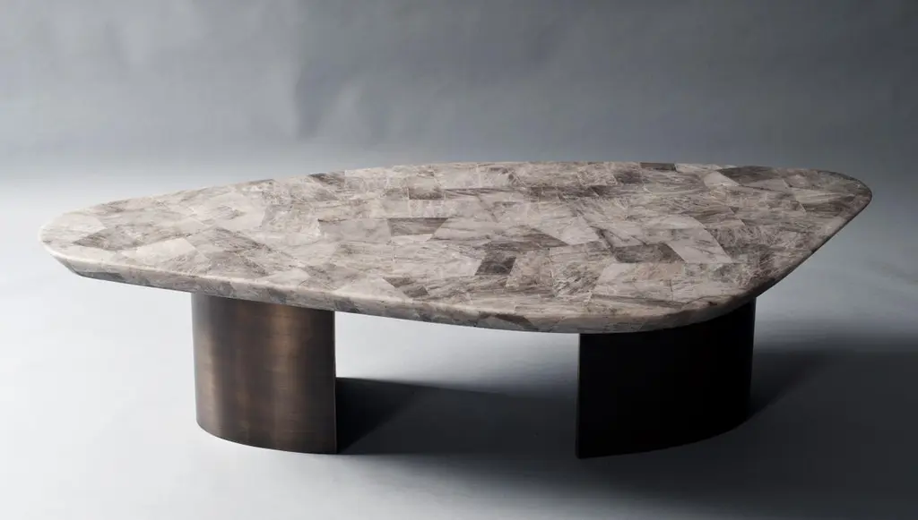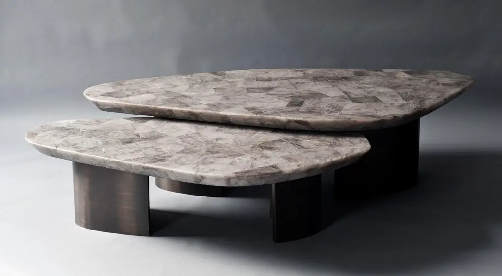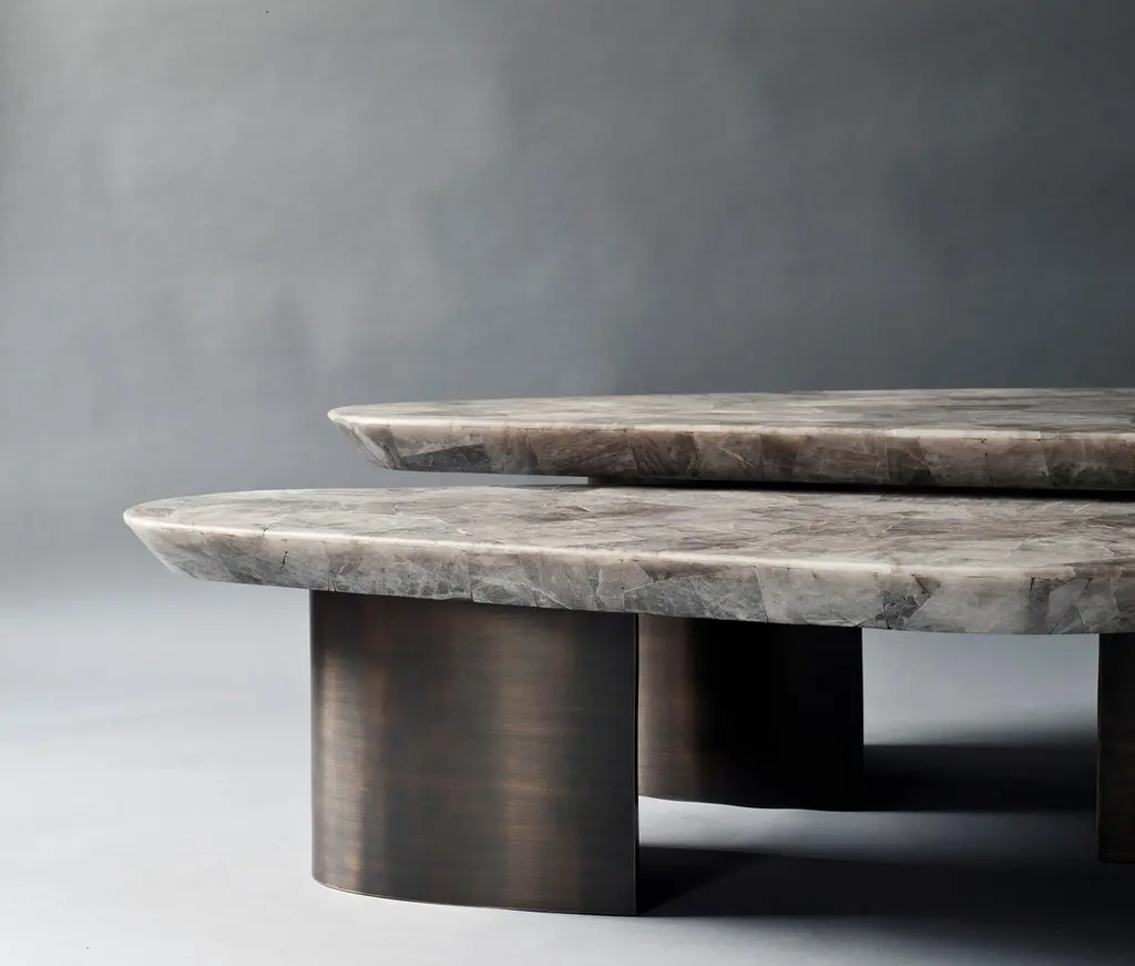 The ledge nested coffee or cocktail tables have sculptural tops in leathered Smokey Quartz supported by an antique brass base. The tables can be purchased individually or as a pair as shown.DimensionsMEDIUM: 1622mm [64"] (W) X 807mm [32"] (D) X 394mm [15.5"] (H)SMALL: 1266mm [50"] (W) X 680mm [27"] (D) X 329mm [13"] (H)NESTED: 1915mm [75.5"] (W) X 1210mm [47.5"] (D) X 394mm [15.5"] (H)