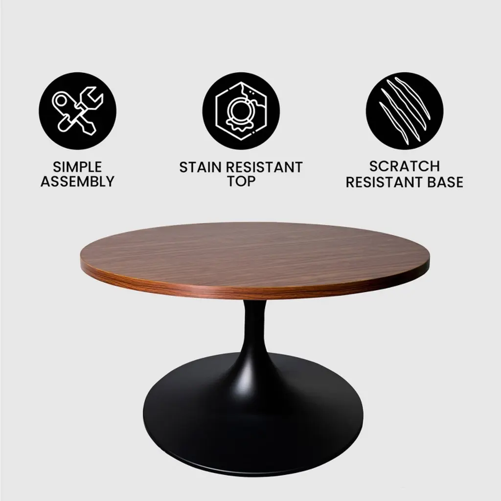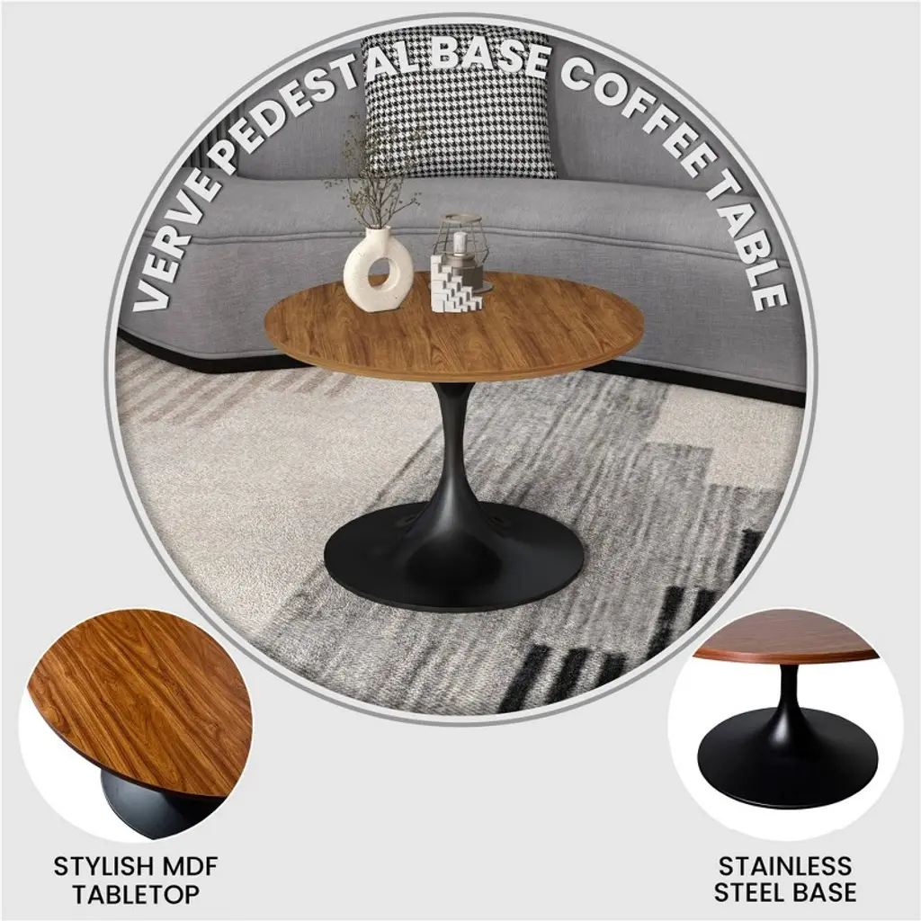 Bring a touch of modern elegance to your home with the Verve Coffee Table. Featuring a smooth wooden MDF top and a sleek black tulip pedestal base, it offers the perfect balance of beauty and durability. The powder-coated stainless-steel base provides strong support, making this table a reliable addition to any room. Its compact size fits into cozy spaces without sacrificing style, while the wide round surface offers ample room for essentials or decor. The Verve Coffee Table is the perfect centerpiece for a space where function meets timeless design.