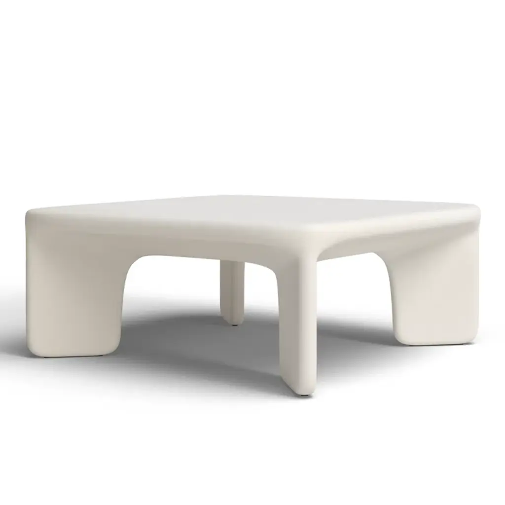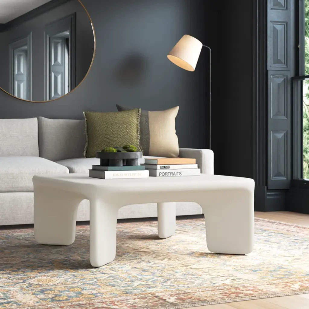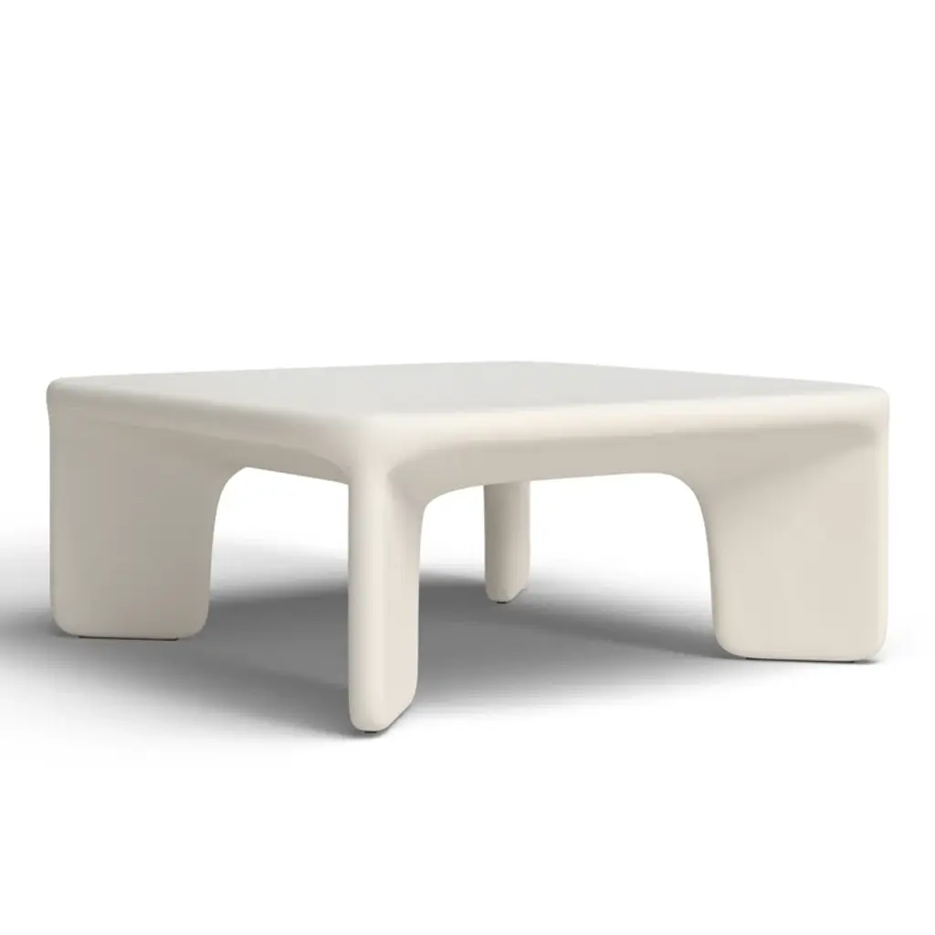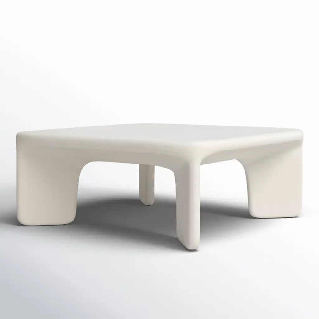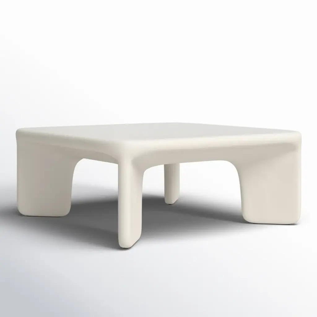 Adobe vibes. Made entirely from white-finished cast concrete, soft, chunky proportions lend a look of depth to this voluminous, uniquely sculpted coffee table. Indoors or out; cover or store inside during inclement weather and when not in use.