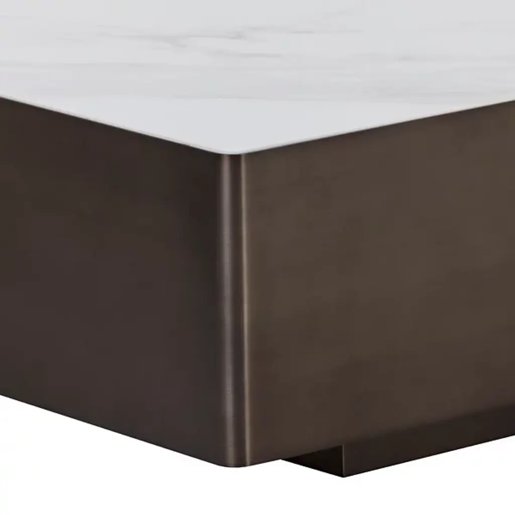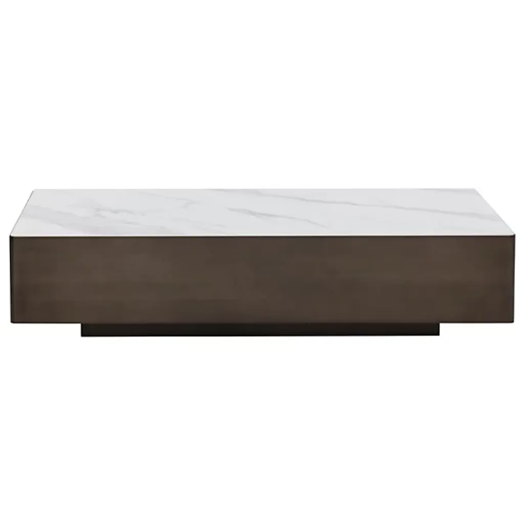 The Lenay Coffee Table from Sunpan is a stunning example of minimalist design, offering a clean and modern aesthetic that enhances any living space. Its elegant white marble-look ceramic top exudes sophistication, beautifully contrasting with the sleek dark bronze stainless steel base. This combination of materials creates a striking visual appeal, making the Lenay Coffee Table a perfect centerpiece for contemporary interiors. Whether placed in a living room or an office, this table effortlessly elevates the ambiance with its refined simplicity and timeless style.