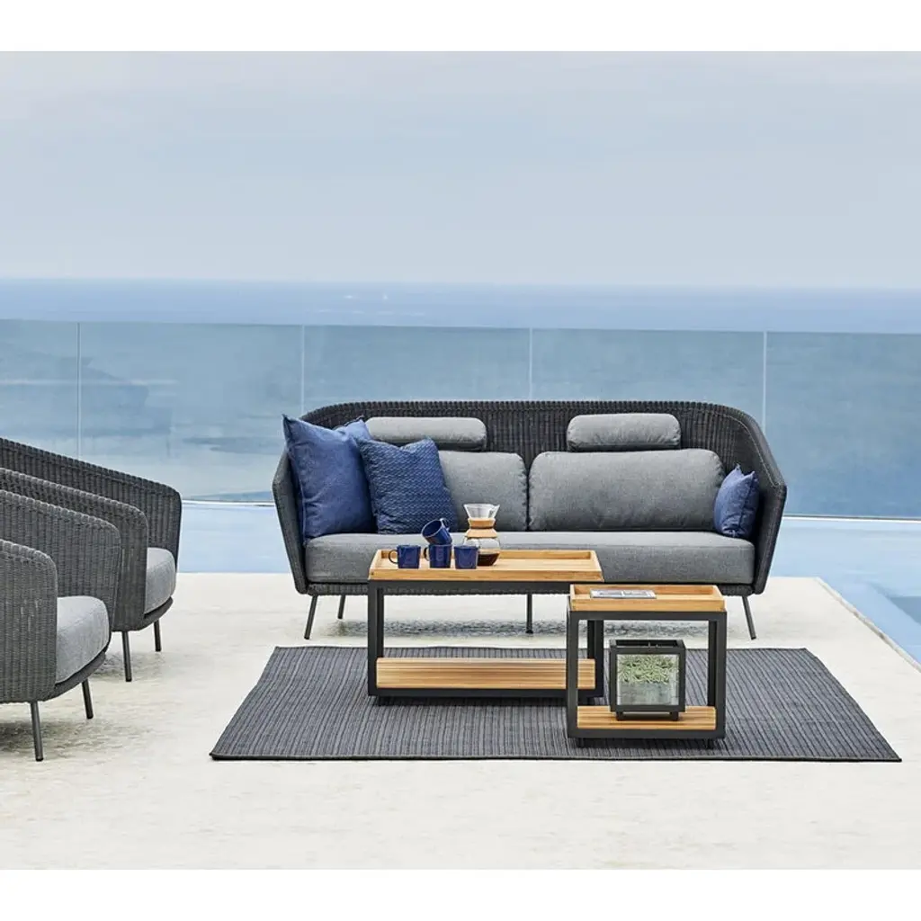 Cane-line’s Level coffee table is a teak wood patio table with a bold, cubical aluminum frame. Created by the design studio byKATO, the Level table was named after its two-level design: thanks to the separate upper and lower levels, you can use the Level table both as a coffee table as well as a shelf for small items in the patio, balcony or outdoor kitchen. The asymmetrical teak wood slats allow rainwater to drain off the table, and the small edges on the upper level allow you to safely place a cup or glass close to the edge. The Level coffee table is made from sustainably produced, certified teak, which will develop a charming, gray patina over time.