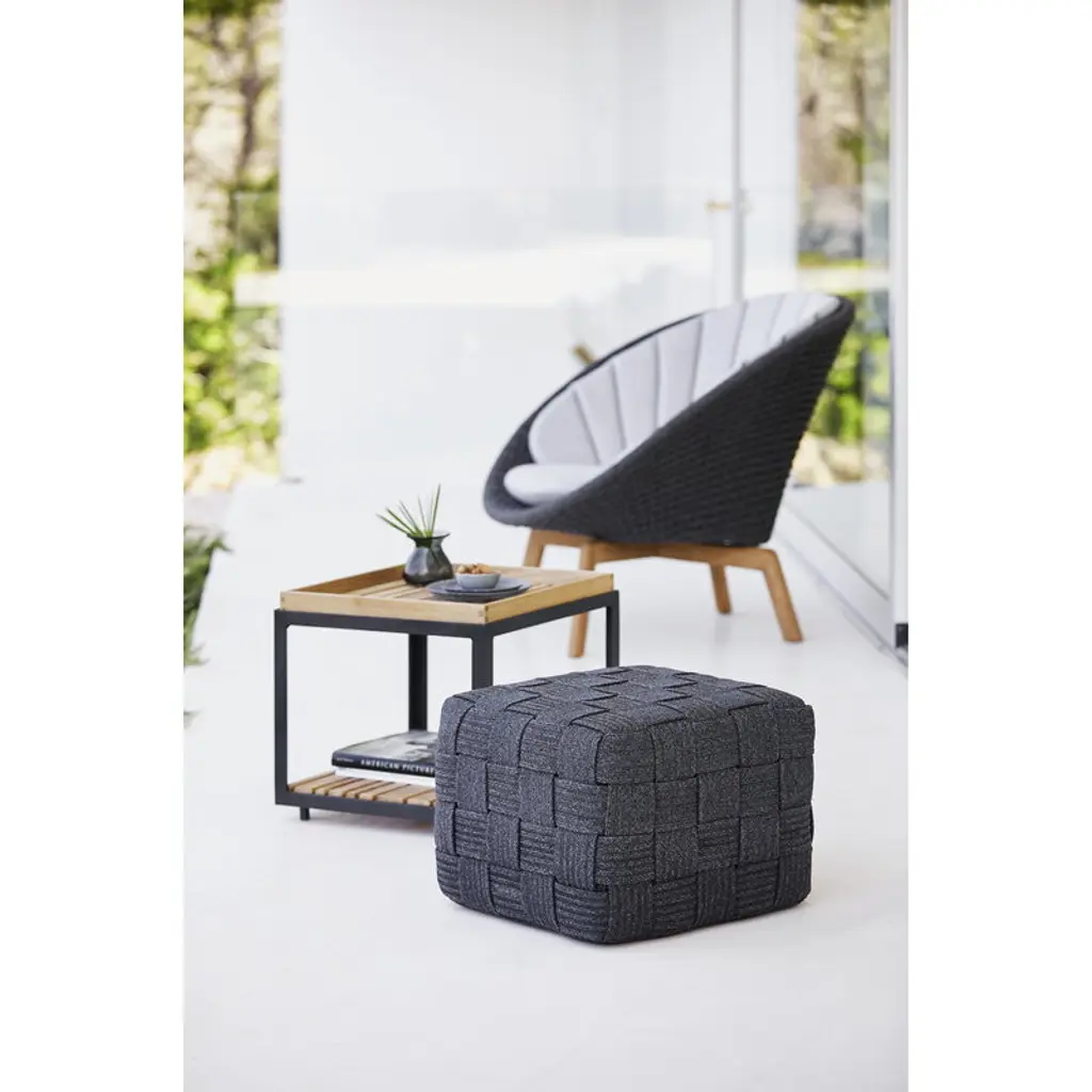 Cane-line’s Level coffee table is a teak wood patio table with a bold, cubical aluminum frame. Created by the design studio byKATO, the Level table was named after its two-level design: thanks to the separate upper and lower levels, you can use the Level table both as a coffee table as well as a shelf for small items in the patio, balcony or outdoor kitchen. The asymmetrical teak wood slats allow rainwater to drain off the table, and the small edges on the upper level allow you to safely place a cup or glass close to the edge. The Level coffee table is made from sustainably produced, certified teak, which will develop a charming, gray patina over time.