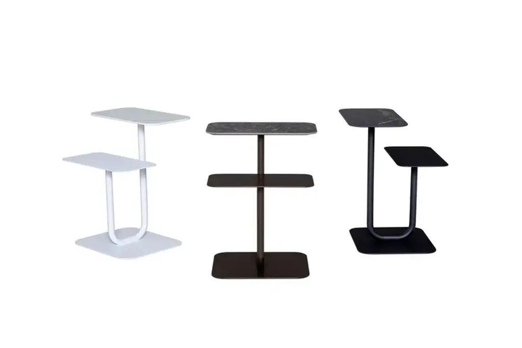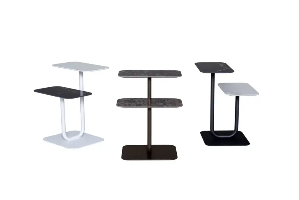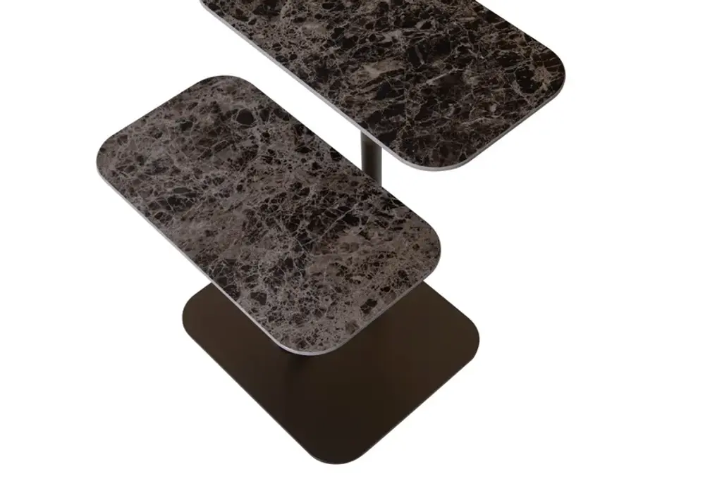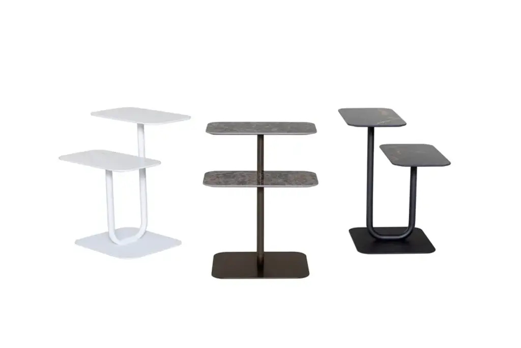 The Levels coffee-table is characterized by a U-shaped tubular structure and by the different height of the two support surfaces. The tops are available in the same finish as the base or in the version with porcelain stoneware tops.Finishes:Porcelain stoneware top: onyx grey porcelain stoneware, statuario altissimo porcelain stoneware, Portoro porcelain stoneware, onyx amber porcelain stoneware, Emperador porcelain stoneware.Metal structure: matt white, carbon grey, matt stone bronze.