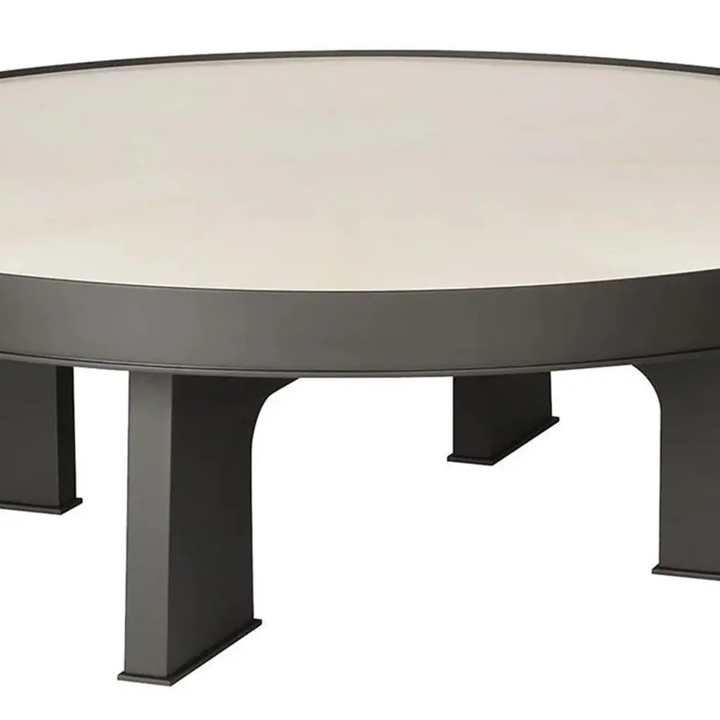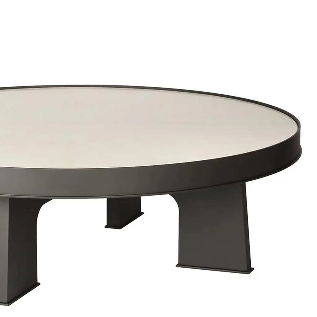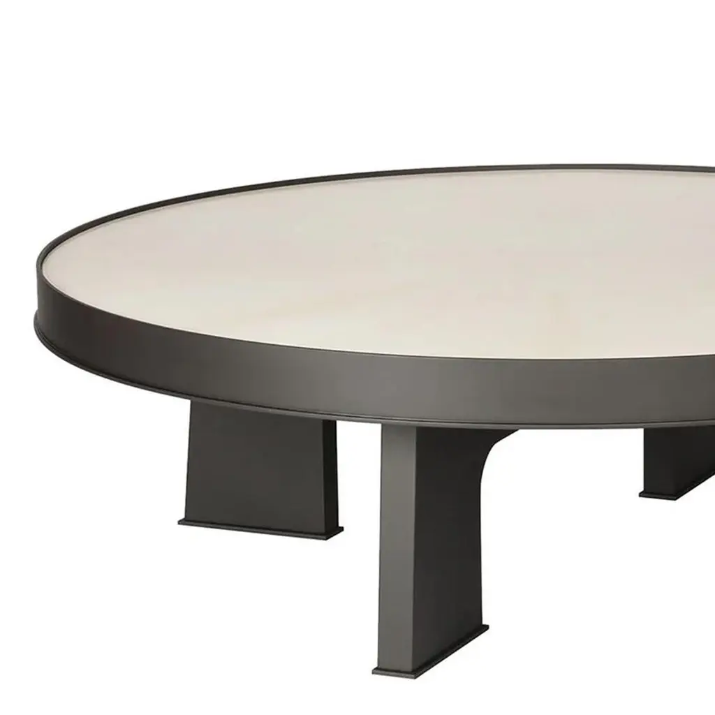 Coffee Table Liena Round with base structure in solid woodin bronzed lacquered finish. Table top in solid wood coveredwith genuine suede leather in white cream finish.Also available on request with other suede colors or leathers.