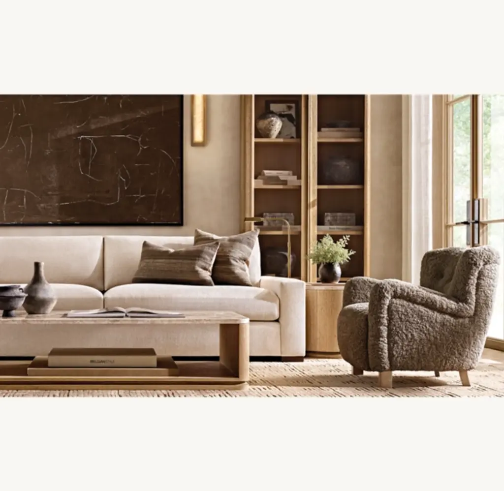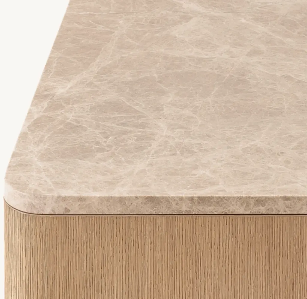 Designed by Julie Lawrence of Roanoke, Virginia, Ligné is handcrafted of American white oak and richly veined marble, each corner wrapped with elegant radius curves. A wire-brushed finish highlights the wood's natural grain, while a slender plinth enhances the understated architectural profile. SHOP THE ENTIRE COLLECTION