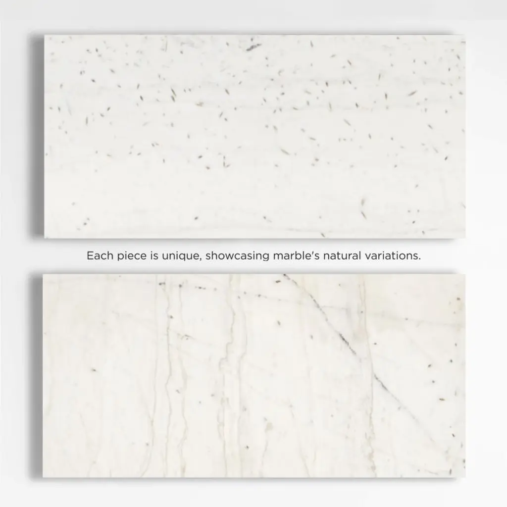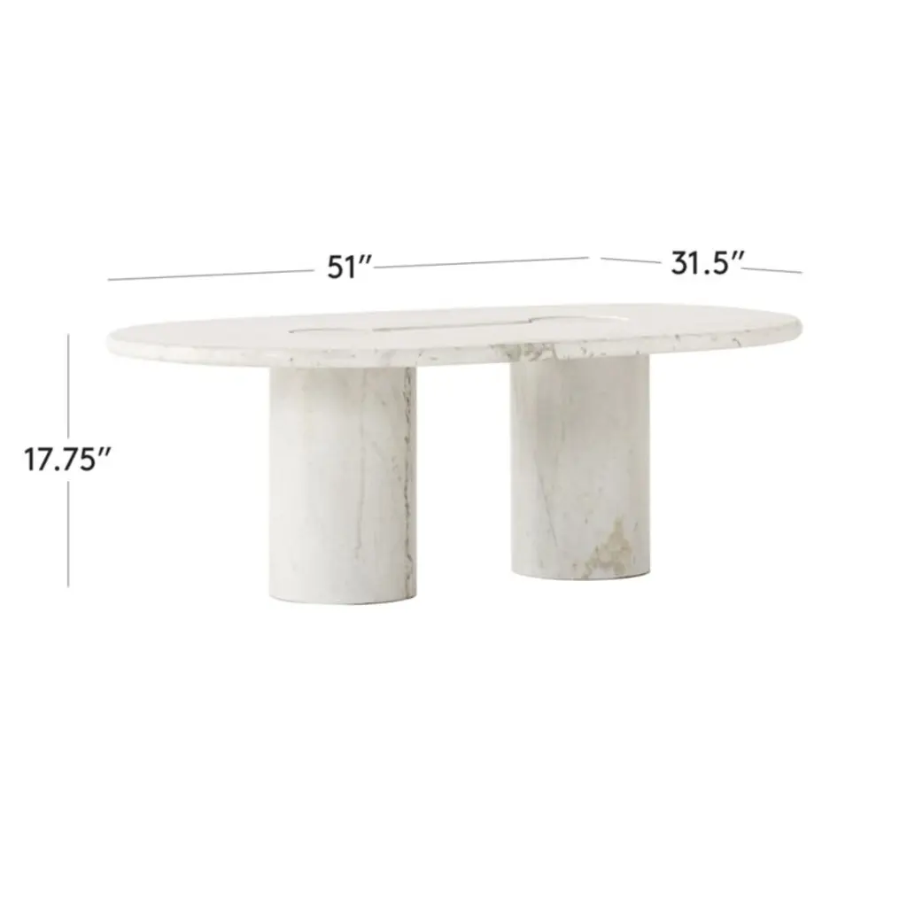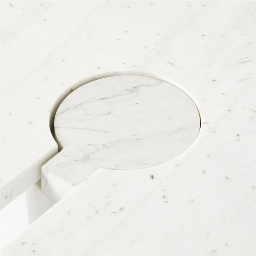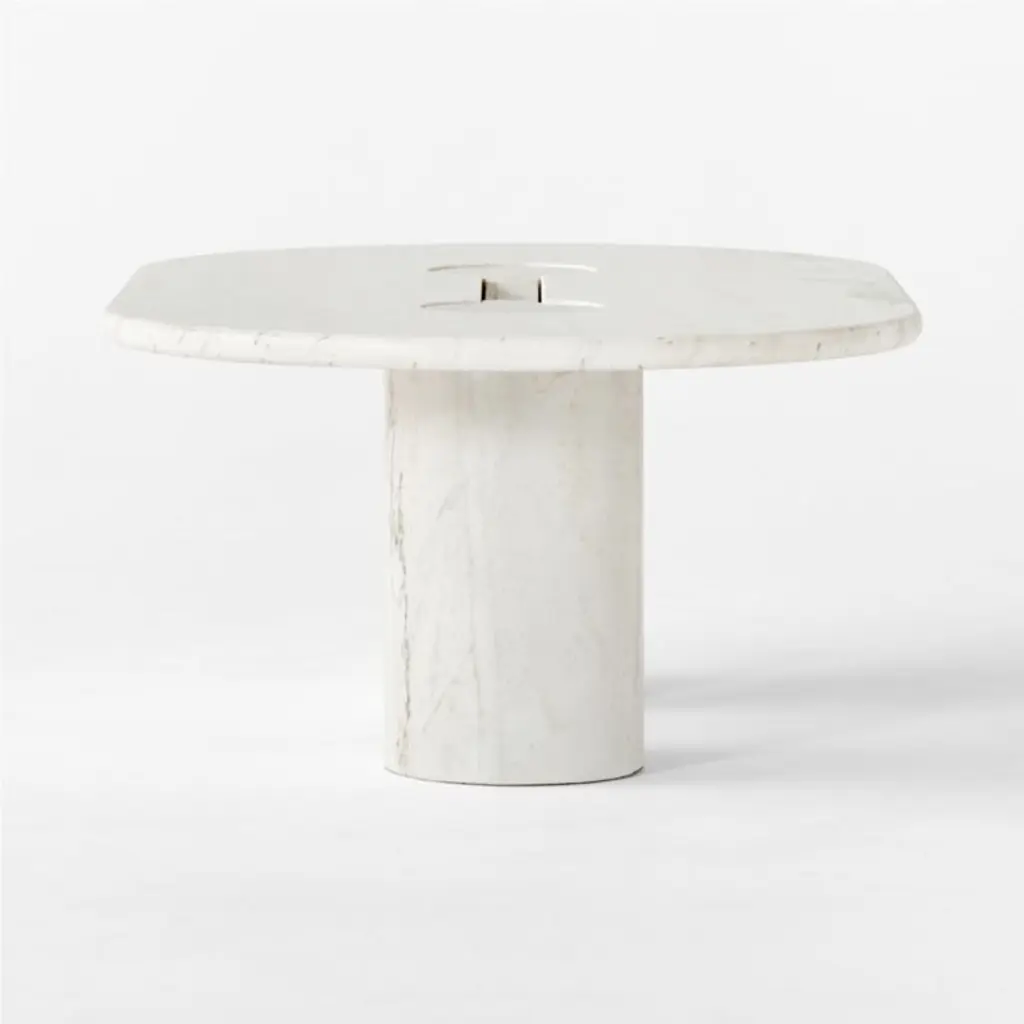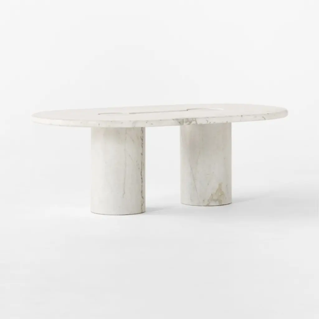 Created by an icon of Italian design, this oval marble coffee table introduces Gianfranco Frattini's creative vision to a new generation of design enthusiasts. Solid slabs of Tornado white marble demonstrate Frattini's mastery of construction. The elegantly minimal structure is created via massive keyhole connections that are self-supporting and interlocking. Conceptually very simple and aesthetically unique, this marble coffee table's striking silhouette is at once contemporary and timeless. CB2 exclusive.