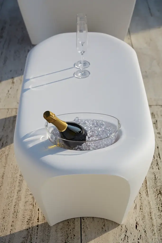 The LILY line is enriched with an exclusive table. Thanks to its unique rounded hole, inside the Poleasy® body, the table can host two spumante bottles, with an optional supplied unit.LILY is a strong and poetic collection designed by MoreDesign. The heart of LILY’s project is the flower petal concept, whom organic shape challenges engineering techniques. A fresh and new interpretation of the concept of living and dining, wherever you are.