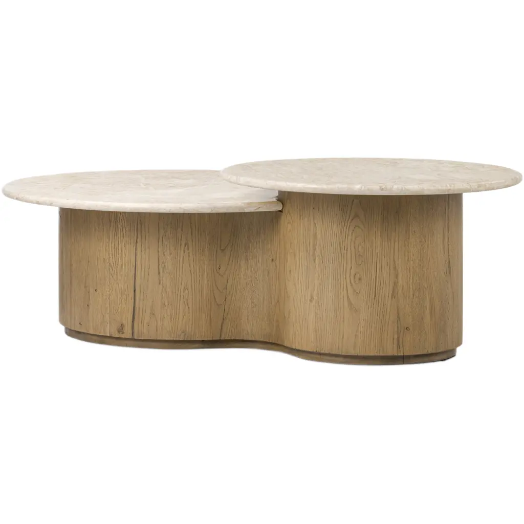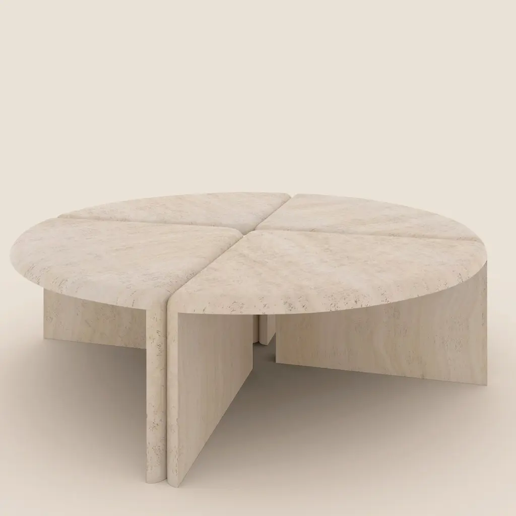 Lily Round Navona Travertine Coffee Table by Fred and JuulDimensions: Ø 122 x H 36 cm.Materials: Honed Navona Travertine.Available in oak, evonized oak and in Navona Travertine. Custom sizes, materials or finishes are available on request. Please contact us.A coffee table handmade out of 30 mm thick solid wood or stone. Divided in 4 quarters, each part has rounded edges that are juxtaposed to the adjacent parts' edges.Fred&Juul, short for Federico Minarelli and Julie Janssen, are two architects who decided working as architects isn’t for them. It was when designing custom furniture for their clients and developing it with the amazingly skilled local artisans that they truly found joy in their work. So, in 2012 they decided to solely focus on that and launched their first lighting and furniture collection. With the exception of the renovation of the old Tuscan farmhouse that would become their home and studio, a labor of sorrow, but mostly love (see the result on the press page!).What sets them apart is how they see and use their materials of choice: bronze, brass, wood and stone. Their designs value the inherent nature of these materials and how they are meticulously crafted, like the grainy, clouded surface of their Raffaele light in sandcast brass or the juxtaposed Oak grains in the marquetry of their Maurits table. Starring all these aspects in the story of a piece, is what makes it unique and last.Over the years they have increasingly worked with interior designers on custom pieces for high end projects all over the world, thanks to their attention for detail, refined aesthetic sense and collaboration with the best highly specialized craftsmen Tuscany has to offer.