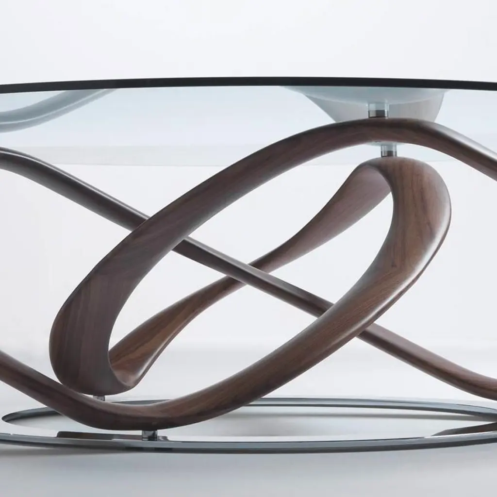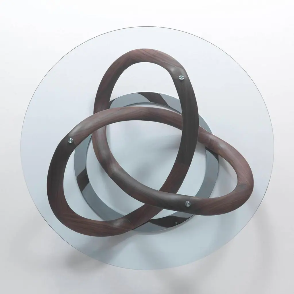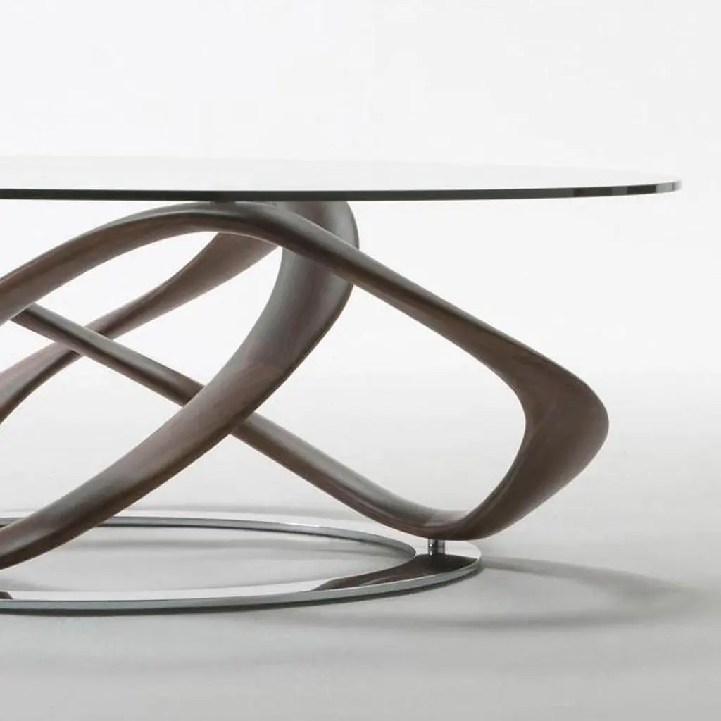 Coffee table Limitless with base in solid walnut wood,handcrafted wood. On chrome-plated metal ground base.With tempered clear glass top (10mm thickness).Available on request in:Diameter 120cm x height 39cm, price: 9600,00€.Diameter 130cm x height 39cm, price: 10400,00€.Diameter 140cm x height 39cm, price: 10900,00€.
