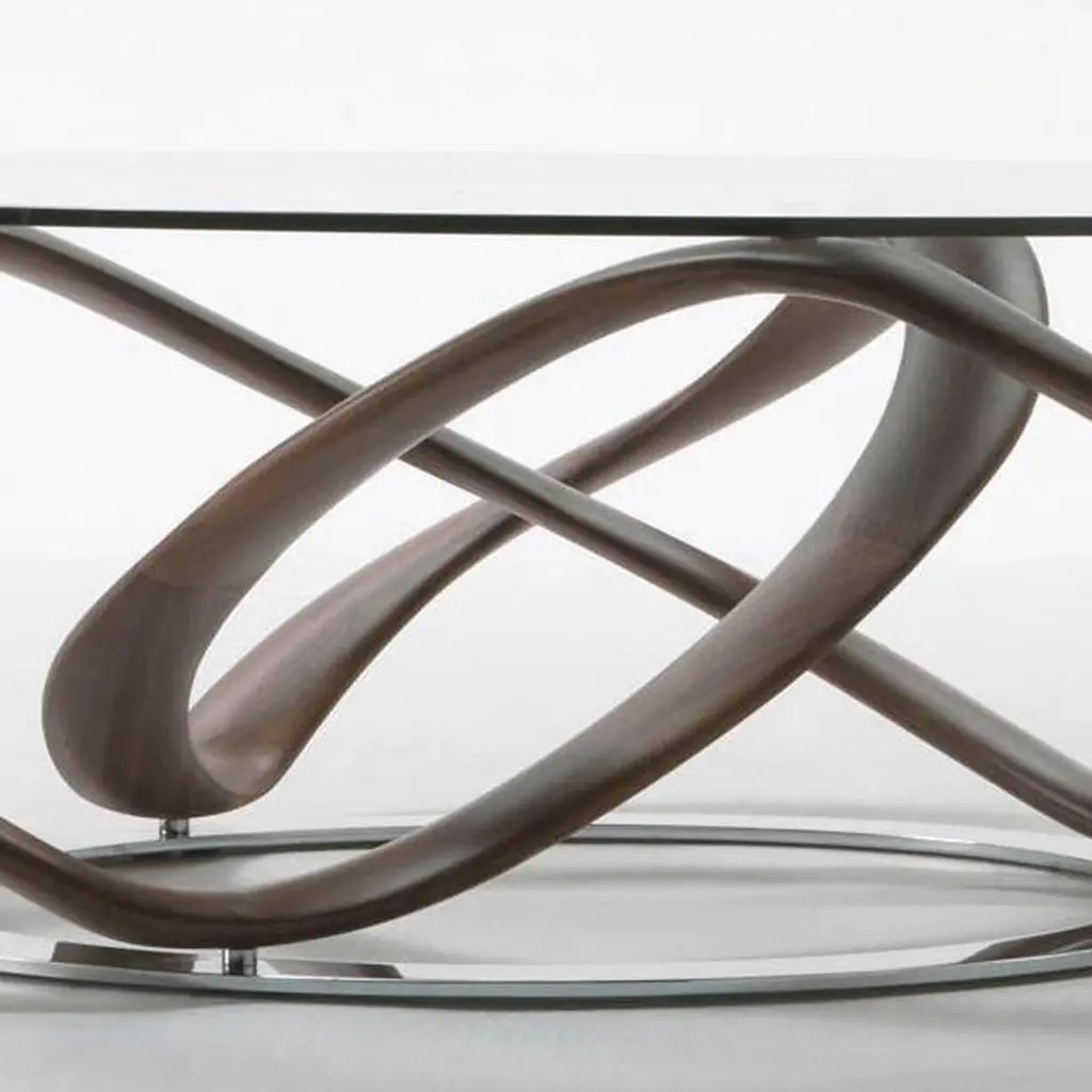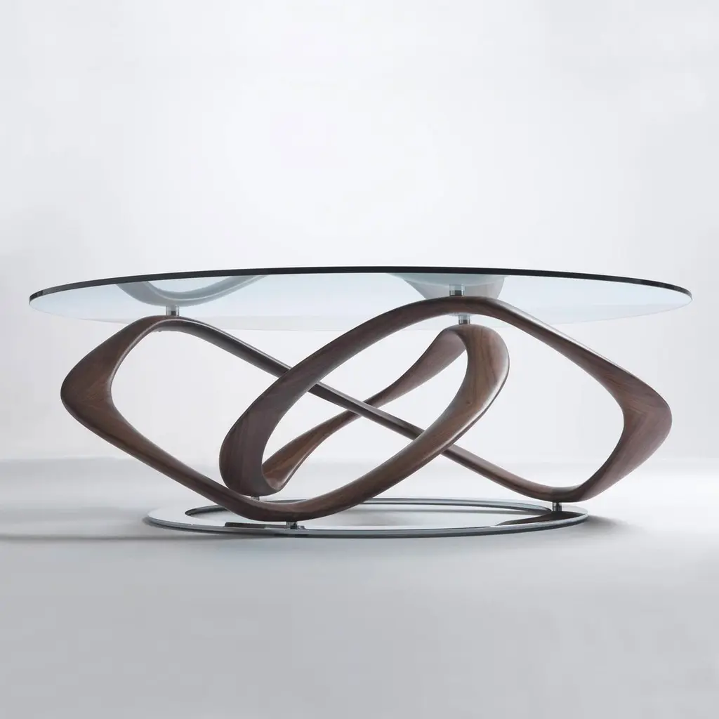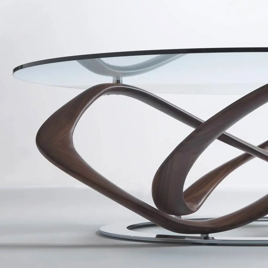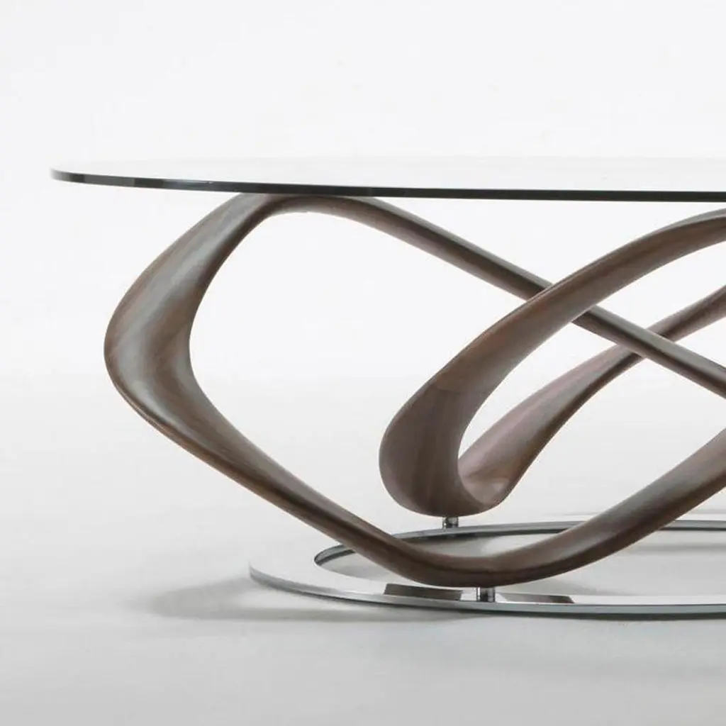 Coffee table Limitless with base in solid walnut wood,handcrafted wood. On chrome-plated metal ground base.With tempered clear glass top (10mm thickness).Available on request in:Diameter 120cm x height 39cm, price: 9600,00€.Diameter 130cm x height 39cm, price: 10400,00€.Diameter 140cm x height 39cm, price: 10900,00€.