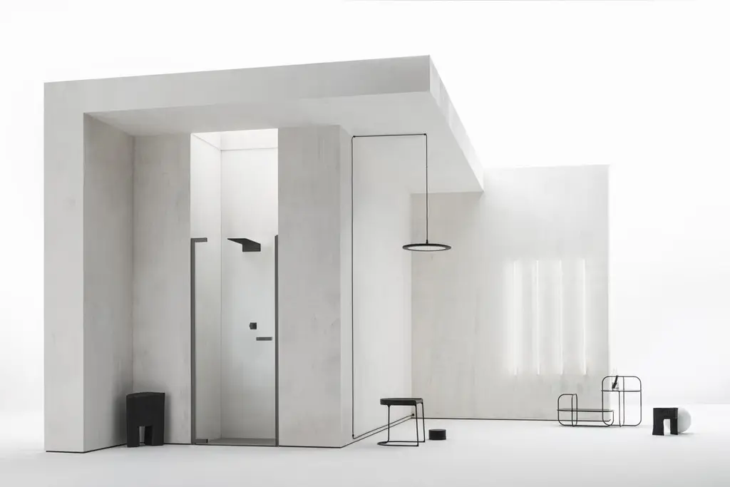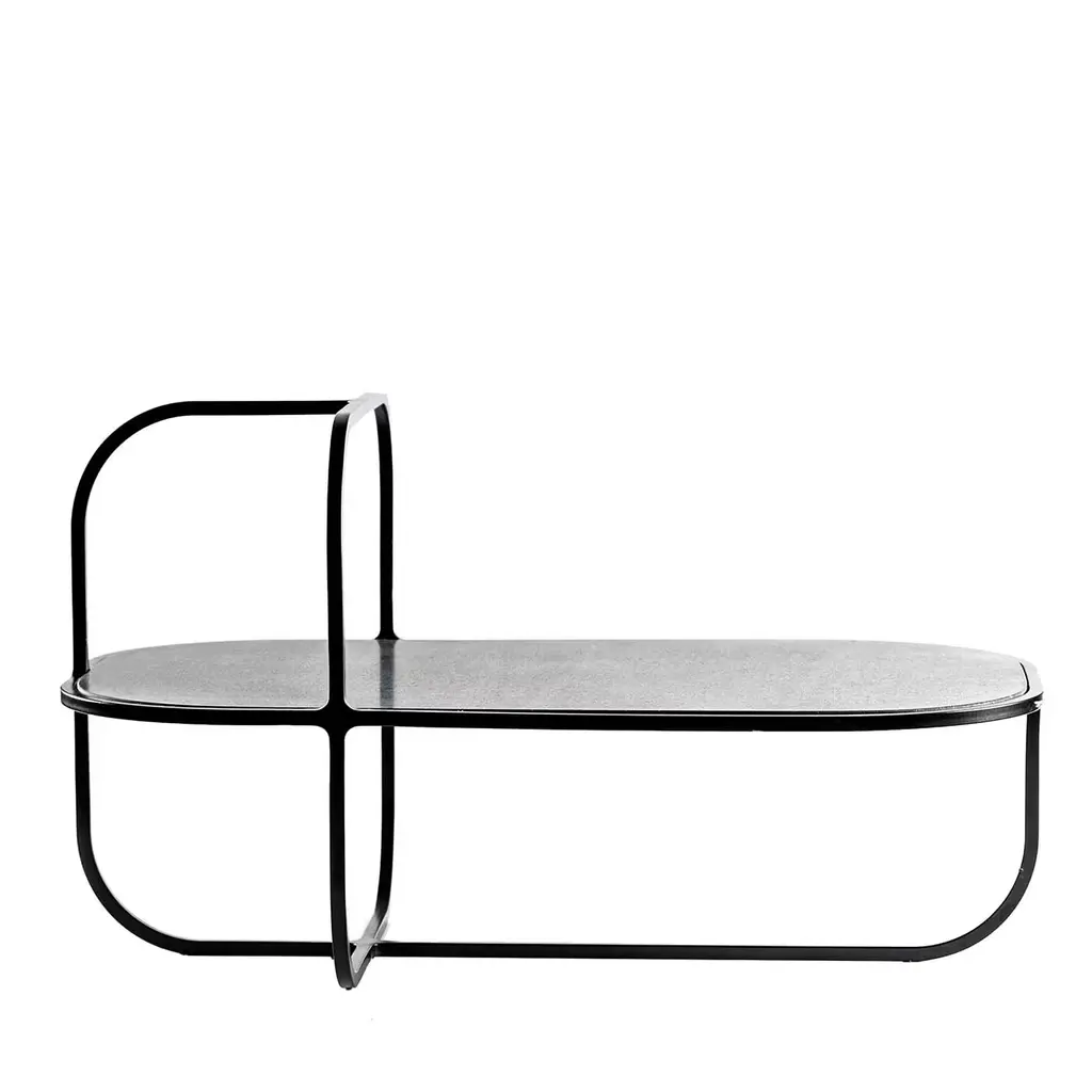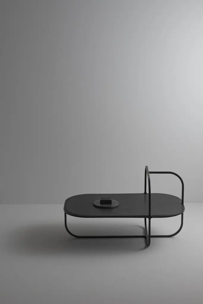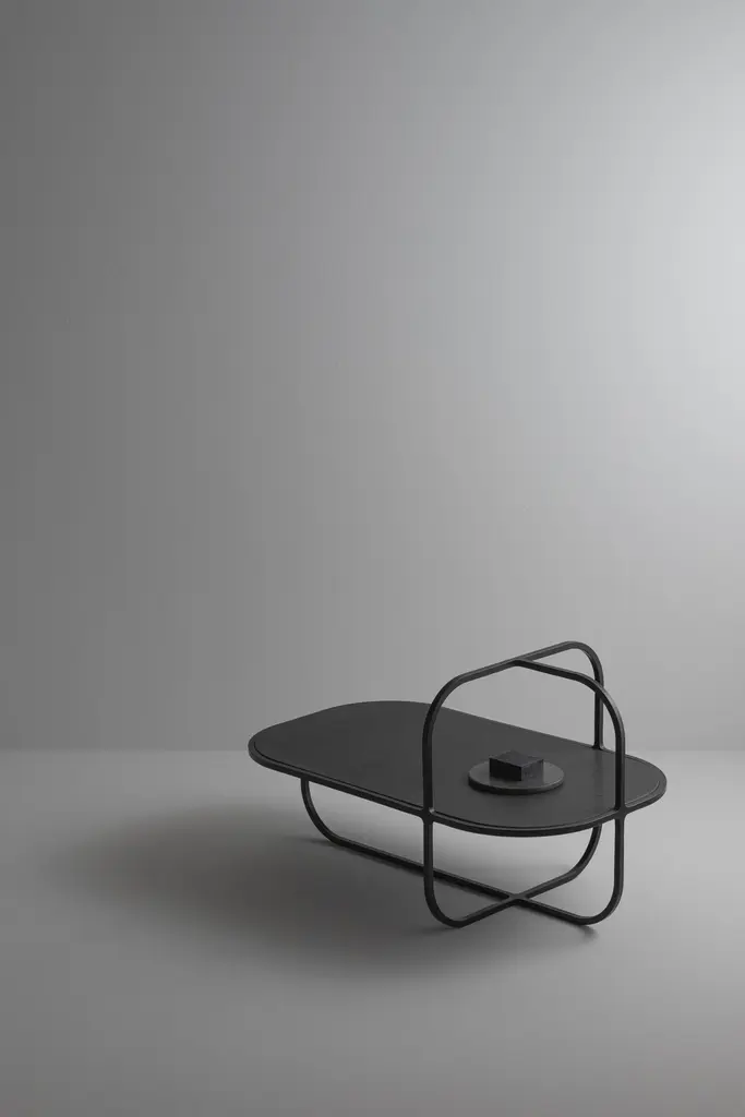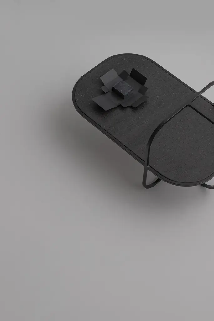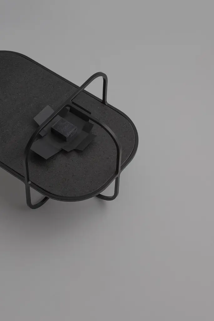 Etna Low coffee table design Martinelli Venezia StudioMaterials: Iron structure varnished with an opaque black powder, top inVolcanic Stone or Bianco Carrara honed finish. Dimensions 675x410x400 mm.